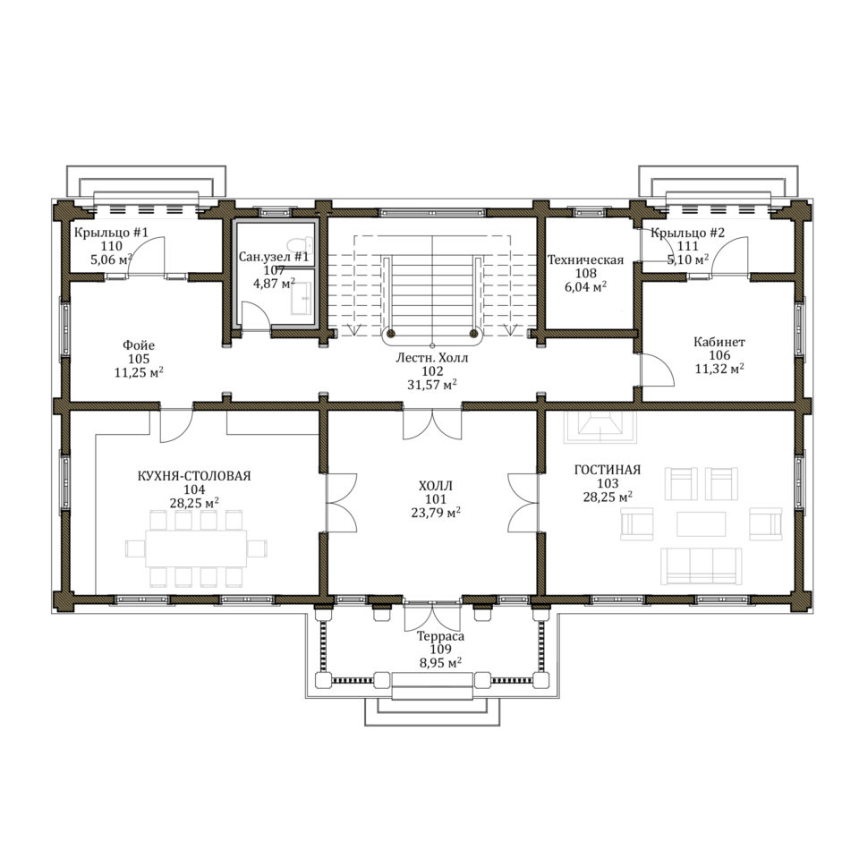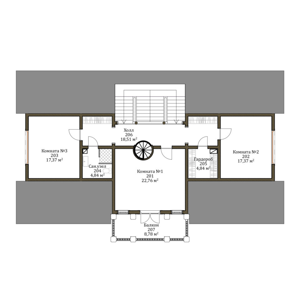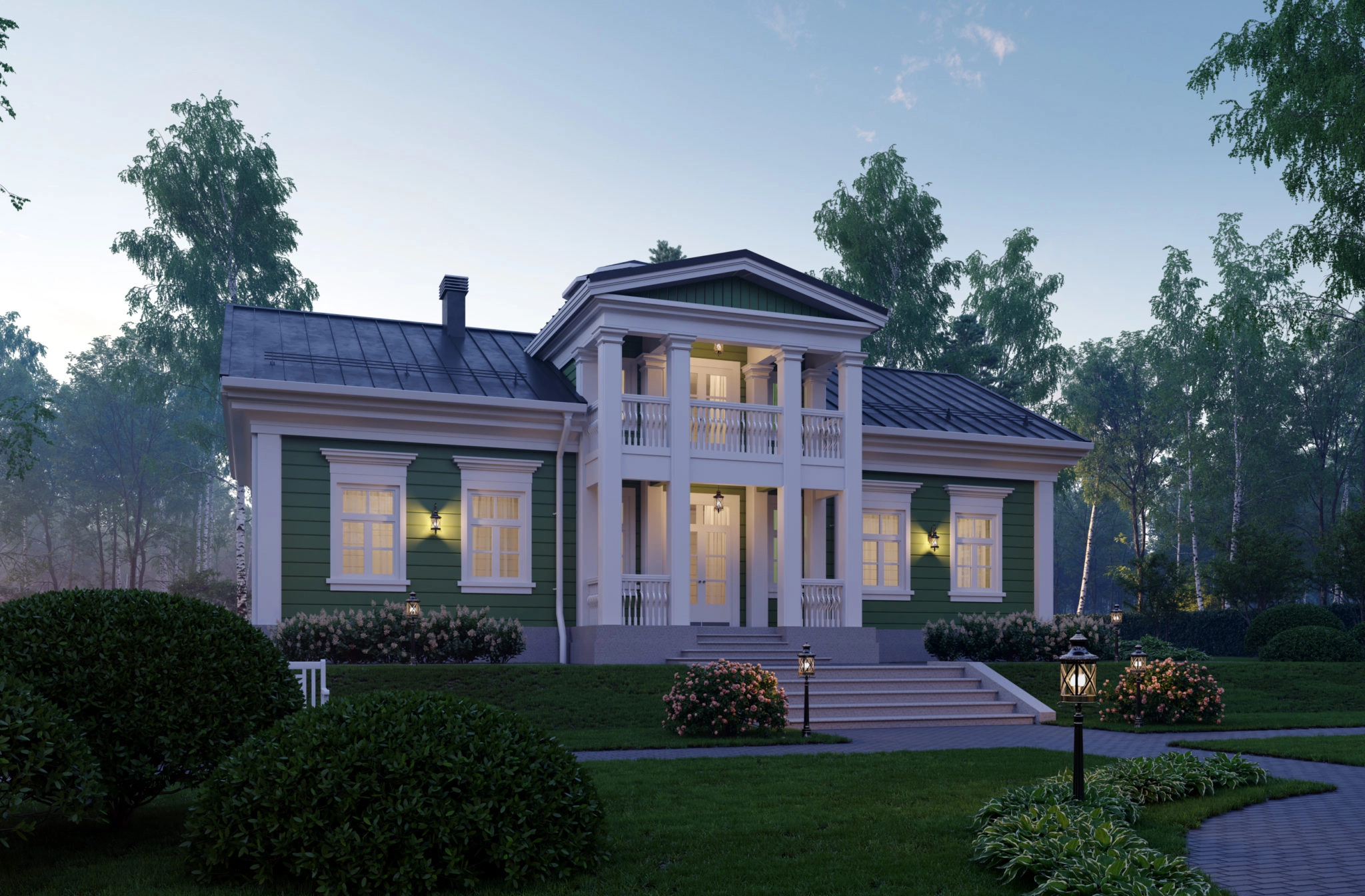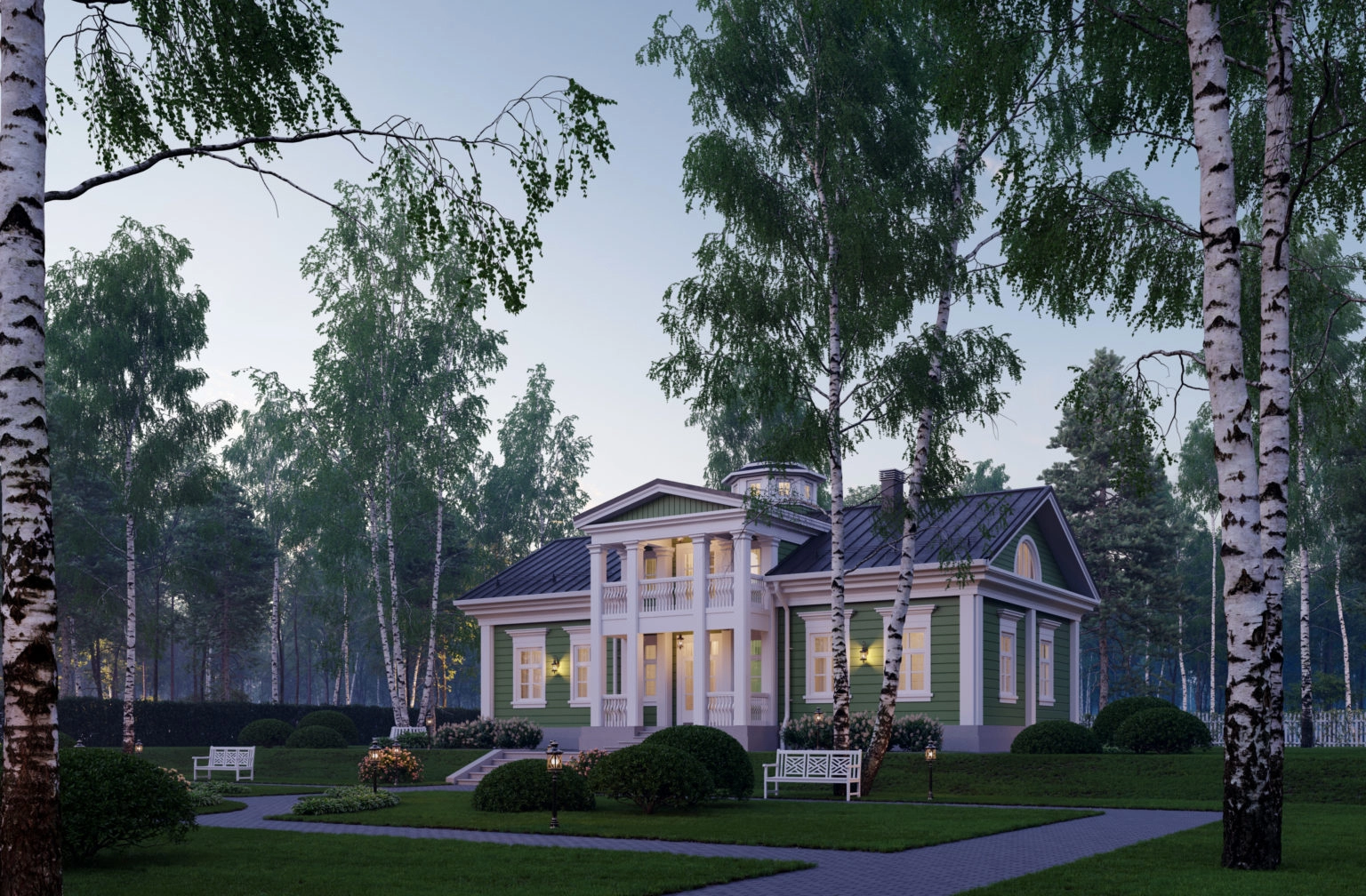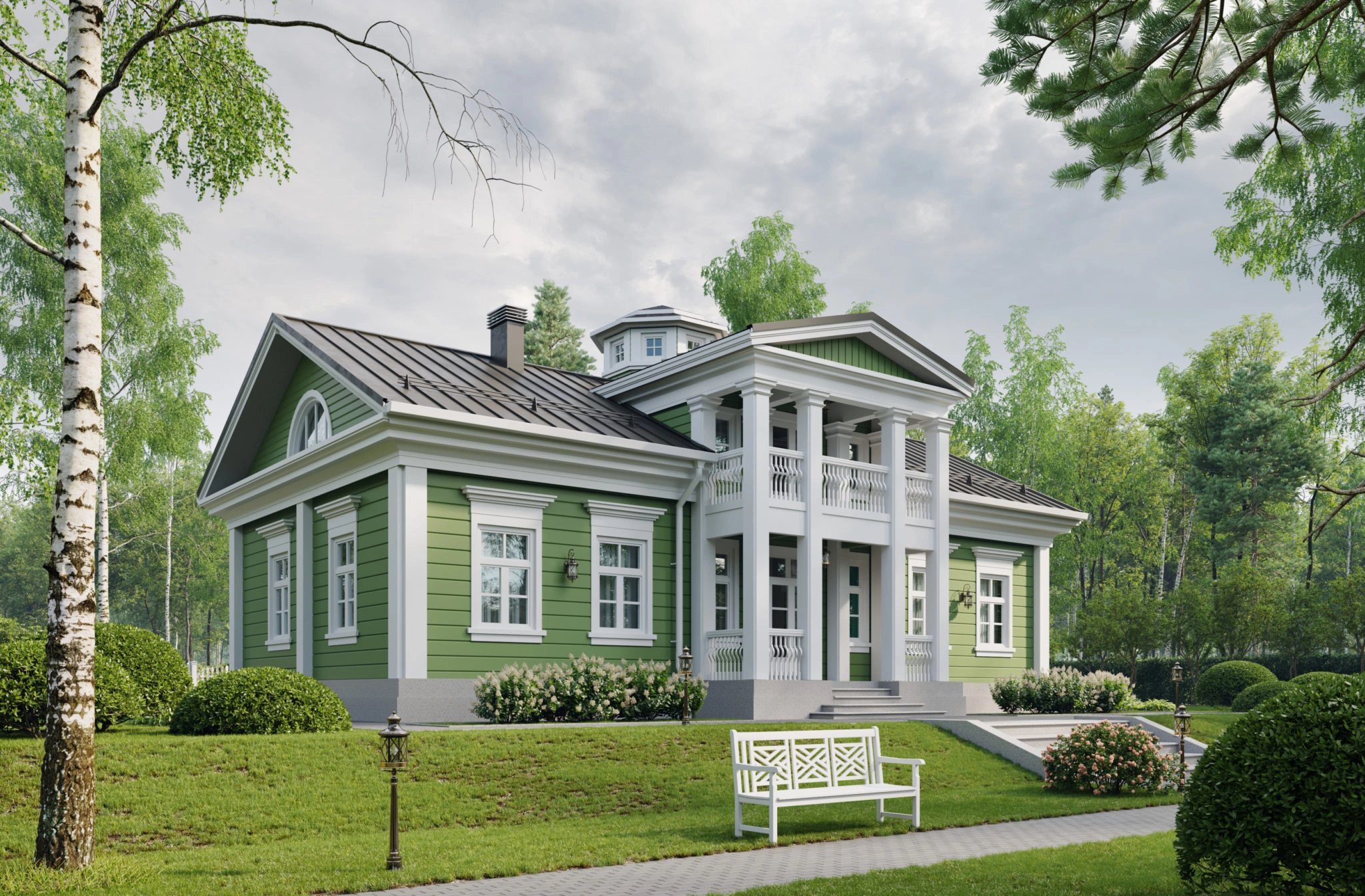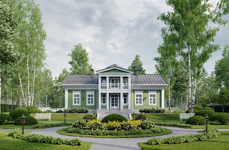 Двухэтажный дом рассчитан на семью из 5 человек. Вход оформлен классическим портиком с четырьмя колоннами. На первом этаже по принципу анфилады мы разместили общие помещения: гостиную, холл, кухню-столовую. Отдельно расположен хозяйский кабинет, имеющий выход на террасу. Технические помещения отделены от жилых внутренним холлом, ведущим к лестнице на второй этаж. Второй этаж спроектирован в виде мансарды. В центральной же части, над главным входом, располагается высокая часть с полным этажом и чердачной крышей. Из холла второго этажа по винтовой лестнице можно попасть в бельведер — круглую обзорную башню, откуда открывается панорамный вид на окружающий пейзаж. Кроме того, на втором этаже мы разместили три личных комнаты, ванную и кладовую. Мастер-спальня имеет выход на просторный балкон. Усадьба Argentum подходит тем, кто ценит классическую эстетику и современный подход к интерпретации традиционных ценностей.