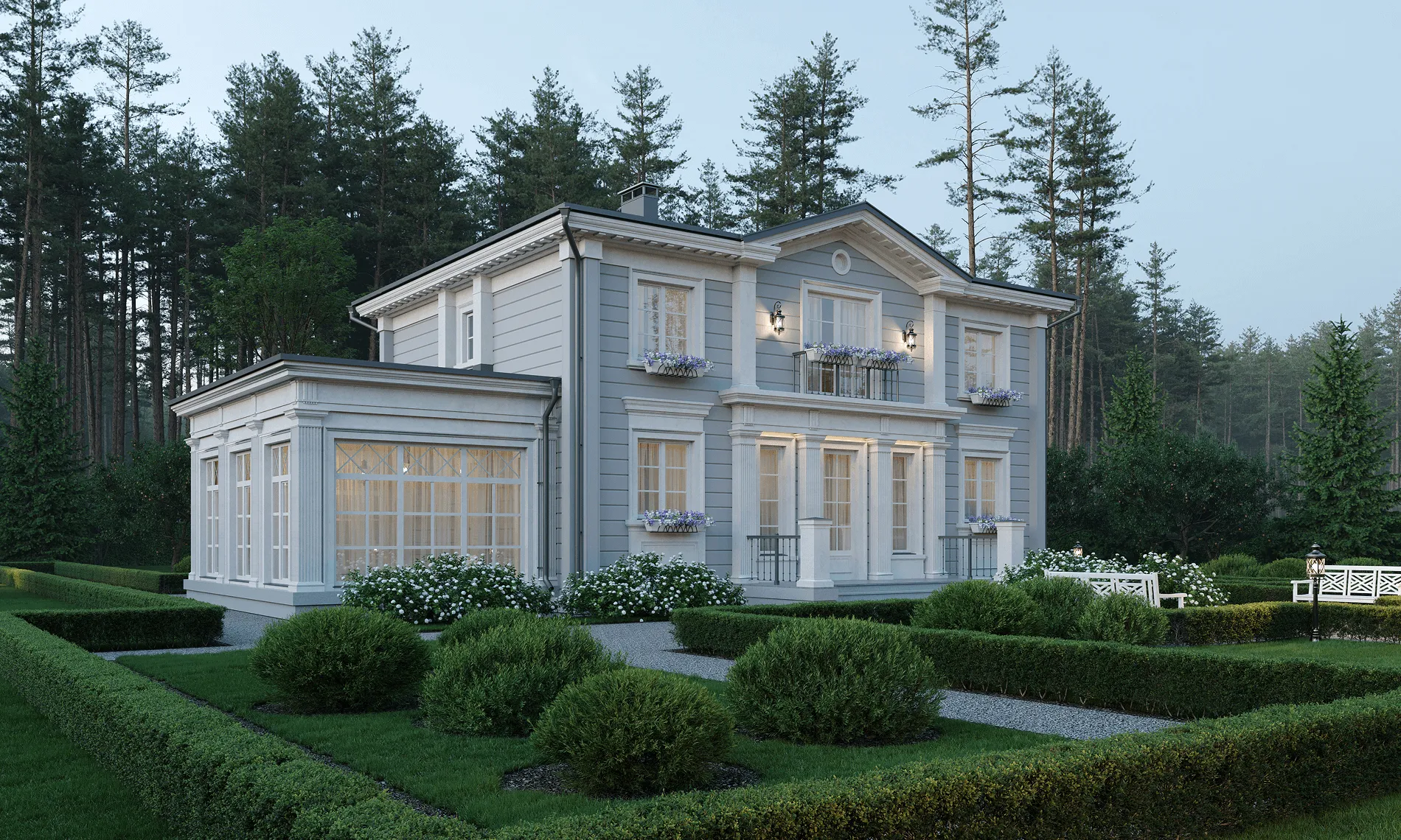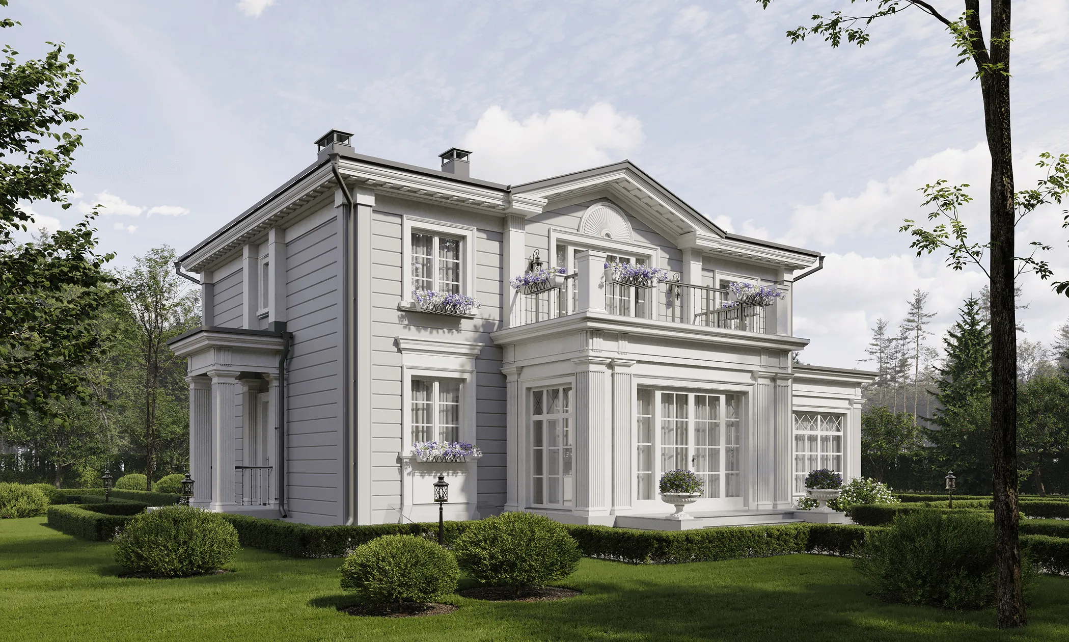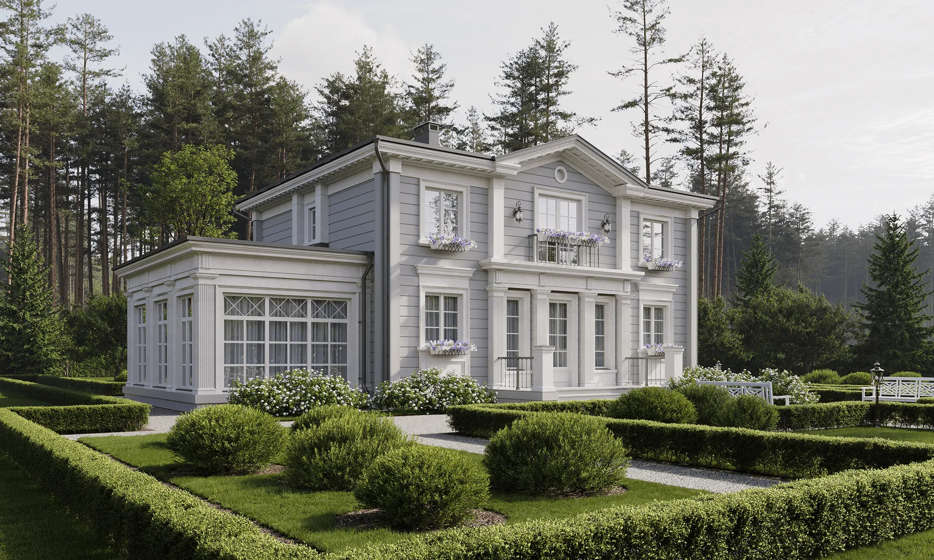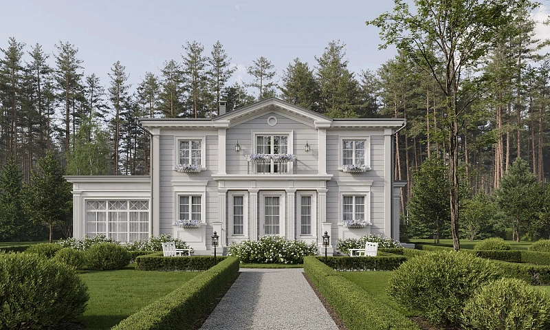 Дом в стиле русская усадьба в живописном месте рядом с лесом – таким был запрос семейной пары. Стиль выбран не случайно: участок располагается в Калужской области недалеко от монастыря Оптина Пустынь, и дом должен гармонично вписываться в местный архитектурный и природный ландшафт. Это не просто дача, а место, где время замедляет свой бег. Как прекрасно просыпаться утром под пение птиц и видеть за окном зелёный простор леса, который плавно перетекает в спокойствие монастырских куполов. А вечера проводить в тепле камина за семейными беседами или общением с гостями. Здесь можно найти вдохновение, уединение, гармонию с собой и окружающим миром. Этот дом создан для того, чтобы лелеять семейные традиции и дарить радость. Перед специалистами стояла задача воссоздать облик русской усадьбы. А это не просто дом – это целостный архитектурно-ландшафтный ансамбль. Участок граничит с лесом, что создает иллюзию перехода в пейзажный парк и лесные угодья, как это было в усадьбах XVIII века. Симметричное двухэтажное здание из бруса площадью 237,77 м2 венчает вальмовая крыша с фронтонами по двум сторонам. Три входные группы и терраса украшены колоннами, а окна – элегантными наличниками, характерными для стиля усадьбы. Фасады выполнены в светло-сером цвете с белыми колоннами и наличниками. Изюминка проекта – витражные панорамные окна столовой и террасы. Дом спланирован таким образом, чтобы обеспечить семье и персоналу комфорт и приватность. Первый этаж занимает площадь 147,7 м2. С главного крыльца вход ведет в просторную прихожую-гардеробную с системой хранения и санузлом. В центральной части этажа – гостиная с мягкой зоной, камином и зоной ТВ. Из гостиной можно выйти на террасу. Благодаря теплому полу здесь можно поддерживать комфортную температуру даже в холодное время года. В левом крыле находится большая столовая для приема гостей площадью 28,59 м2. Оттуда ведет вход в кухню – ее специально сделали изолированной, чтобы запахи от приготовления пищи не распространялись по дому. Правое крыло первого этажа занимают кабинет и холл с лестницей на второй этаж. На втором этаже площадью 90,07 м2 находятся две спальни – обе оборудованы гардеробными и санузлами. Мастер-спальня 16,15 м2 с панорамным остеклением имеет выход на видовой балкон площадью 12,66 м2. В гостевой спальне тоже панорамное окно и французский балкон. Комнаты разделены просторным холлом и представляют собой два самодостаточных блока. Высота потолков на первом этаже 3 м, на втором – переменная: от 2,5 до 3,5 м.