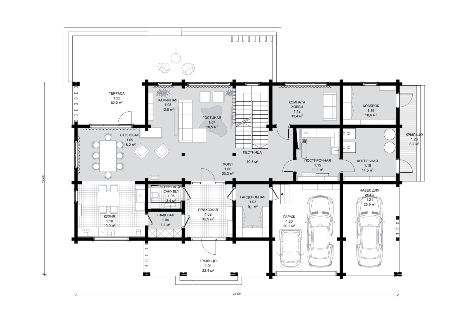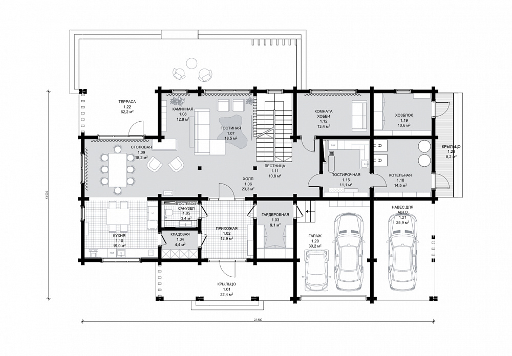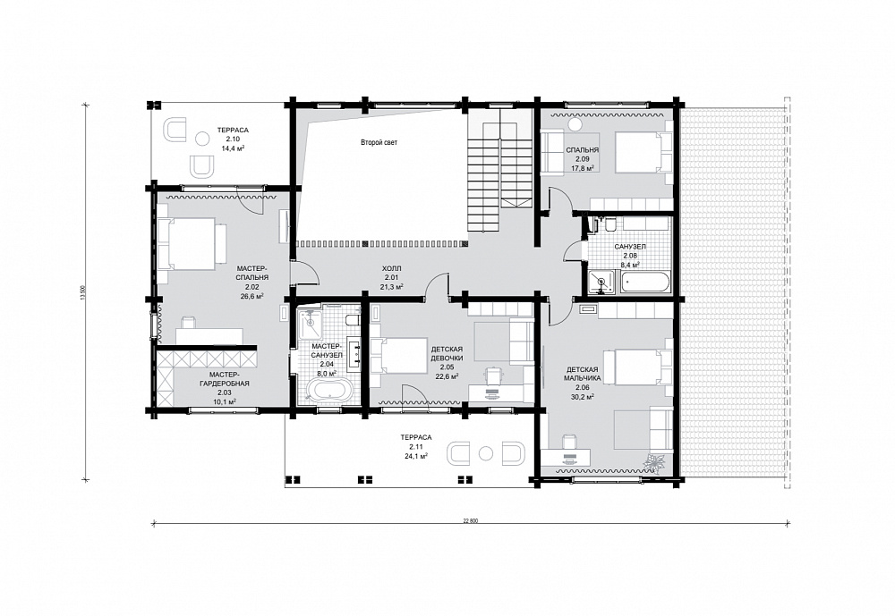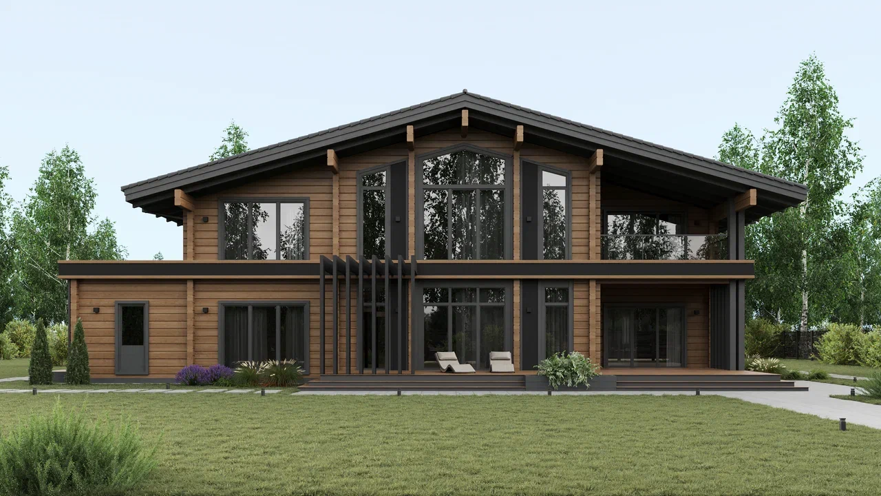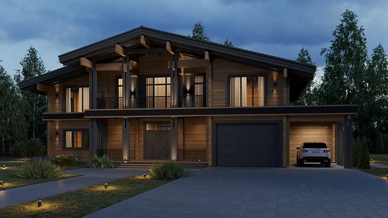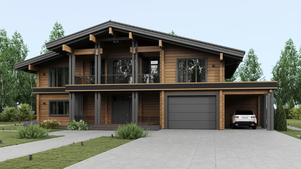 Двухэтажный дом оформлен в стиле современного шале и подходит для семьи из 4–5 человек. Сочетание натурального дерева бежевых тонов и отделочных панелей серого цвета придает внешнему облику дома особую графичность. Завершают образ открытые стропила и декоративные перголы. Широкое парадное крыльцо придает дому особую респектабельность. А планировка по оси позволяет расположить комнаты максимально удобно и функционально. Так, на первом этаже в правой части размещены технические помещения и гараж, а в левой находится общая зона с гостиной, оборудованной вторым светом. На втором этаже находятся гостевая и детские комнаты, мастер-спальня с отдельной ванной и две террасы. Выход на них расположен в детской и главной спальне. Проект Авиталь придется по вкусу тем, кто ценит практичность, комфорт и современную эстетику.