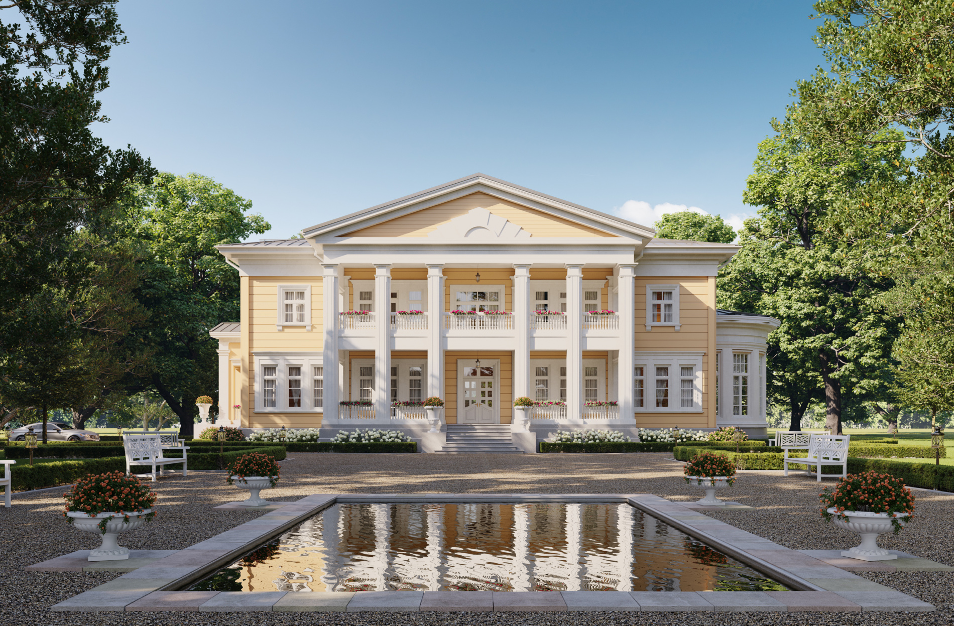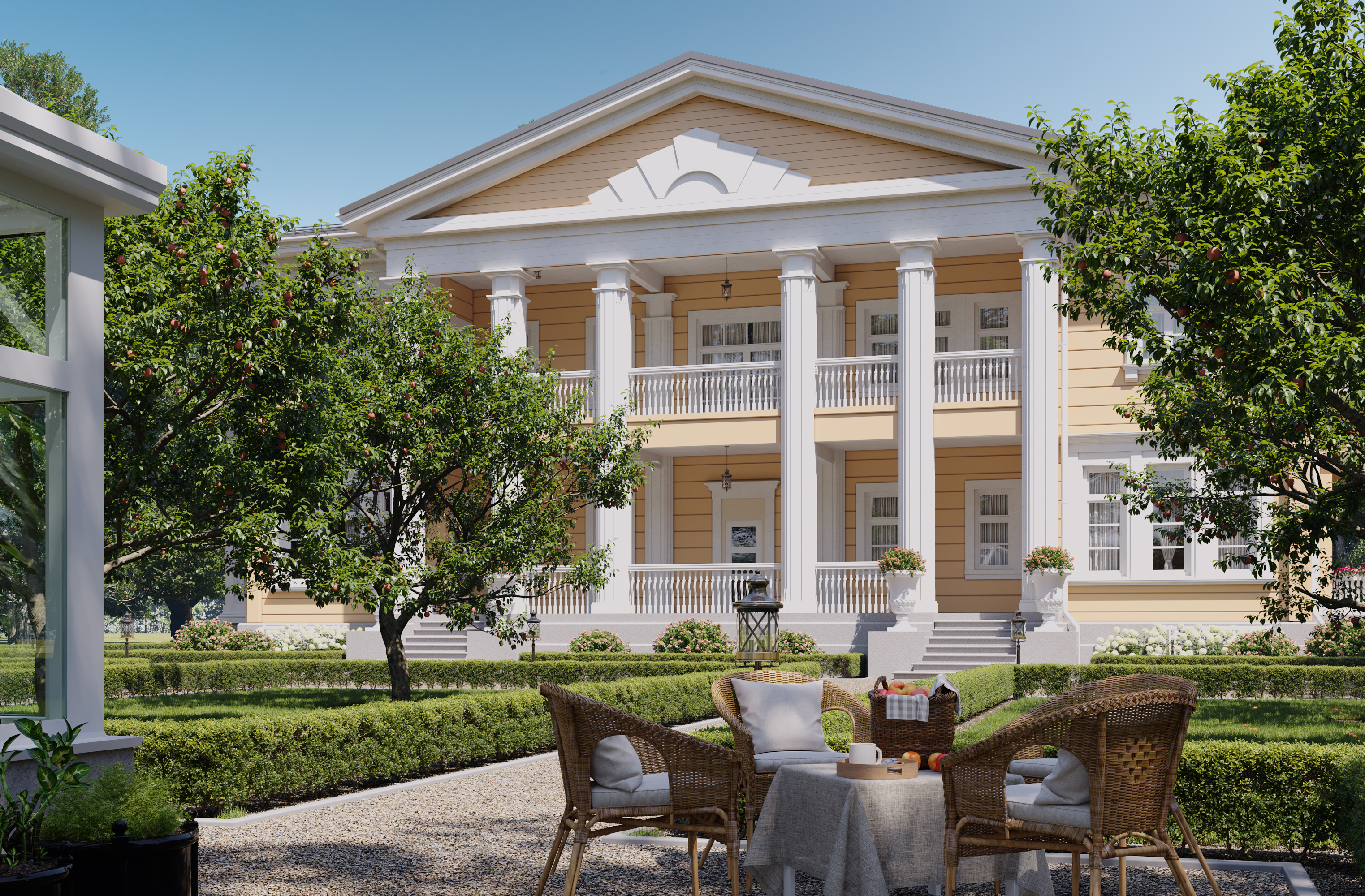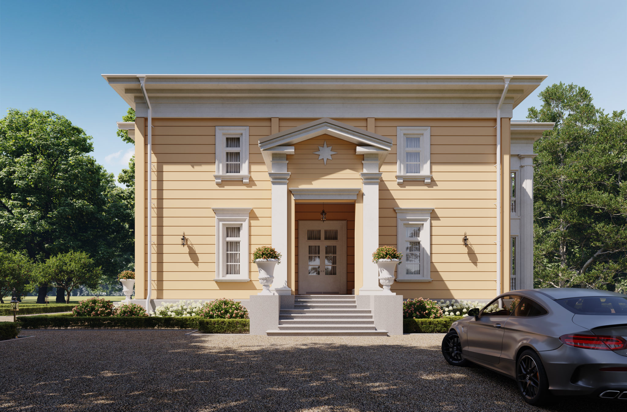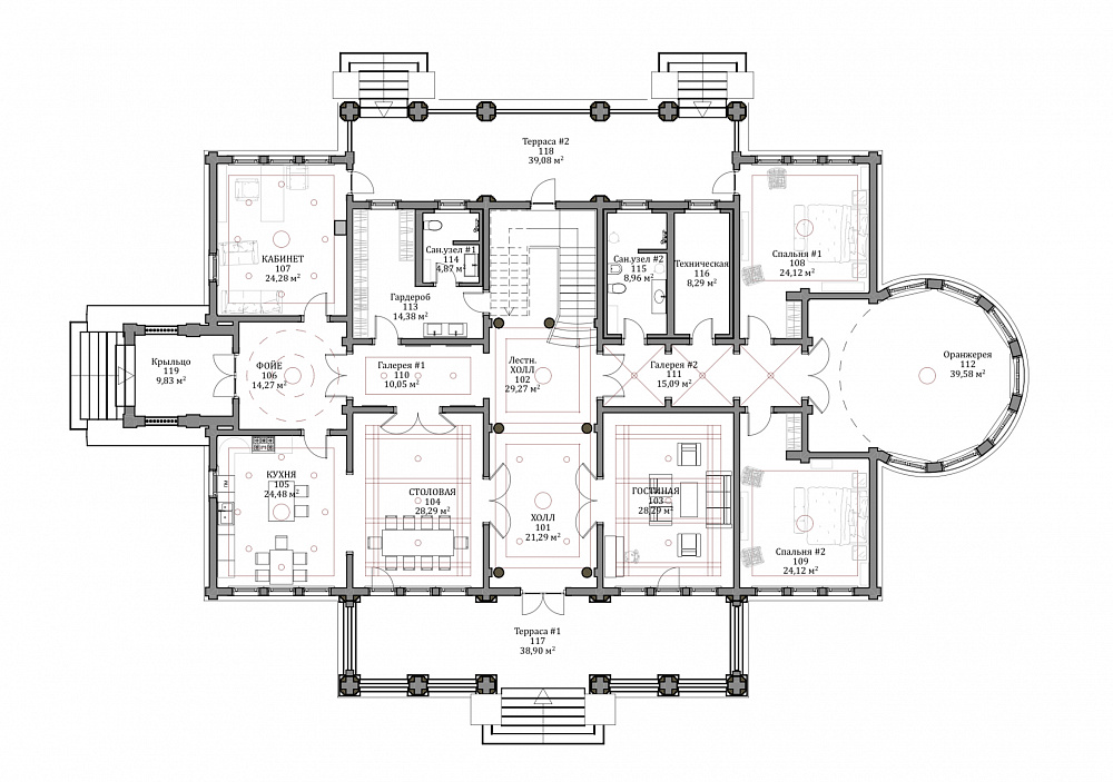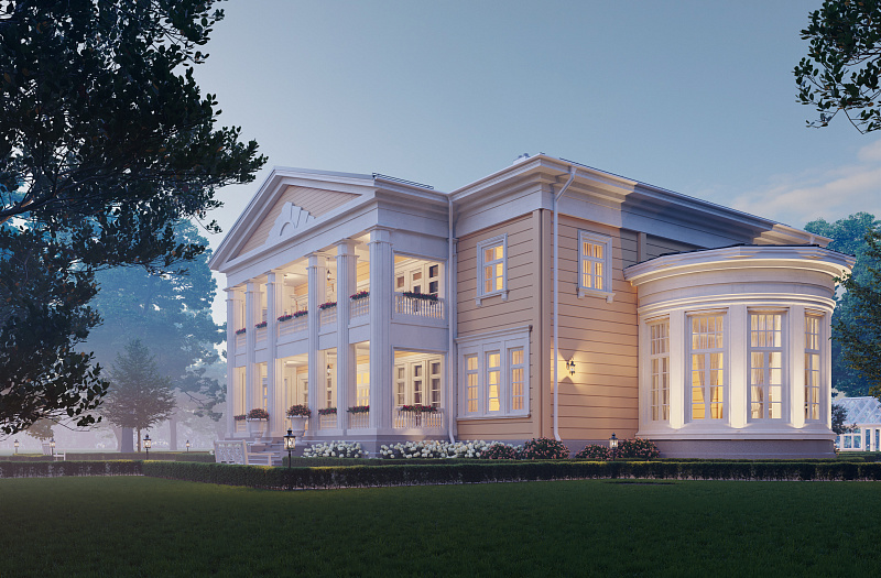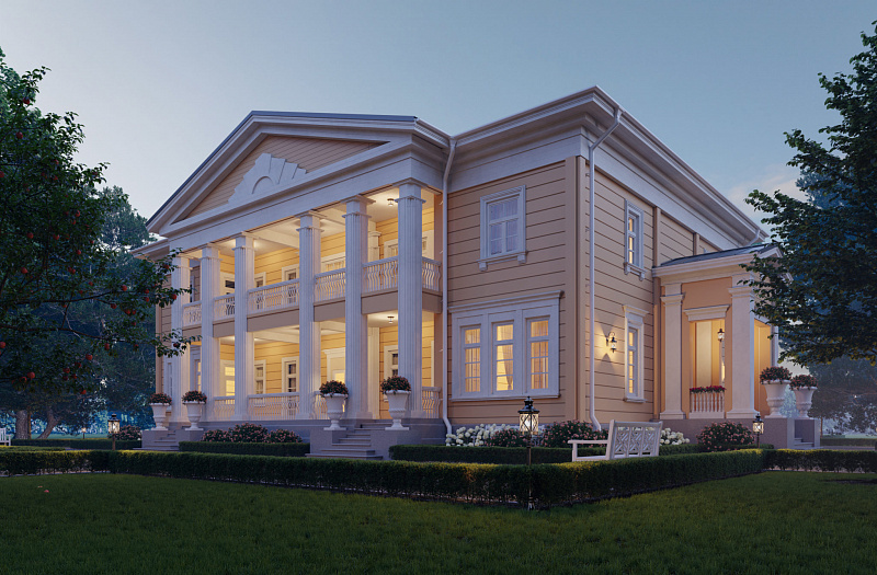 В рамках направления «Старково», цель которого — возрождение дворянской усадьбы, мы разработали проект «Дальний берег». Его уникальная планировка одновременно ориентирована на архитектуру знаменитой усадьбы Горки Ленинские и на лучшие современные образцы частных владений. Резиденция рассчитана на семью из четырёх человек. Уютное общее пространство гостиной, столовой и кухни спроектировано по принципу анфилады. Сквозь весь первый этаж, отделяя жилую часть от технических и вспомогательных помещений, проходит просторная галерея. Она ведёт от главного входа в зимнюю оранжерею. В галерее можно проводить светские приёмы и организовывать праздничные мероприятия. Помимо этого, на первом этаже находятся две просторные гостевые комнаты с отдельными ванными. Такое расположение спален позволяет гостям и хозяевам чувствовать себя более свободно и комфортно и соблюдать личные границы друг друга. Хозяйский кабинет мы разместили рядом с главным входом. Это даёт возможность эффективно работать, проводить совещания и принимать деловых партнеров в удобной обстановке с соблюдением целостности личного пространства. На втором этаже находятся большие хозяйские покои. В них есть просторный гардероб и отдельная ванная комната. Напротив мастер-спальни расположены детские комнаты со своими гардеробными и ваннами. Широкий холл второго этажа выходит на балкон, с которого открывается вид на живописный пейзаж. В холле есть возможность оборудовать библиотеку или разместить хозяйскую коллекцию. Усадьба «Дальний берег» подходит тем, кто заботится о своей репутации, ценит оригинальный подход к планированию пространства и с уважением относится к культурному наследию нашей страны.