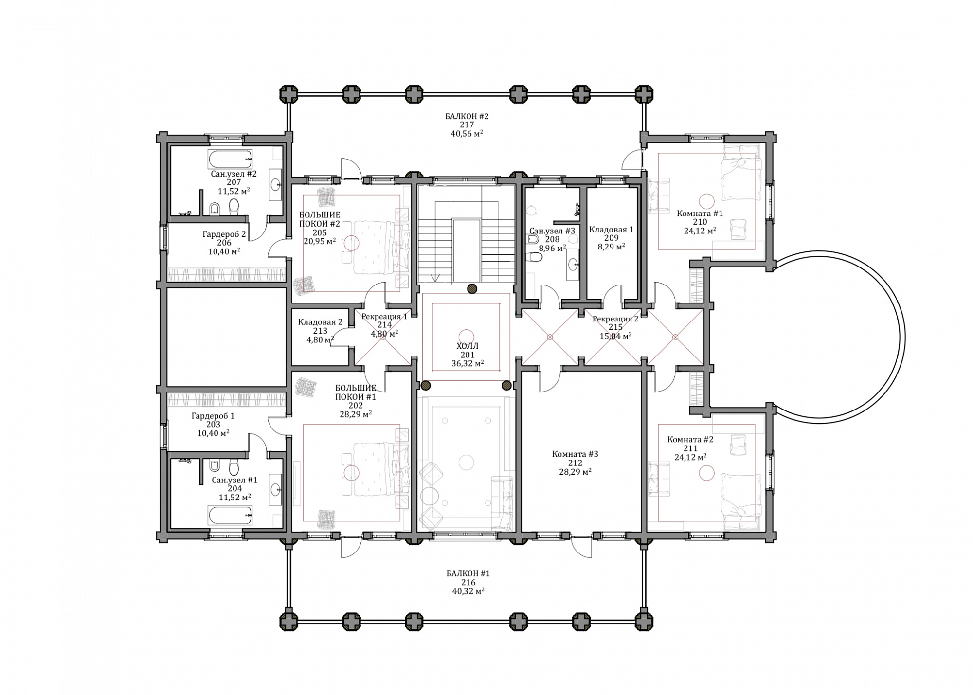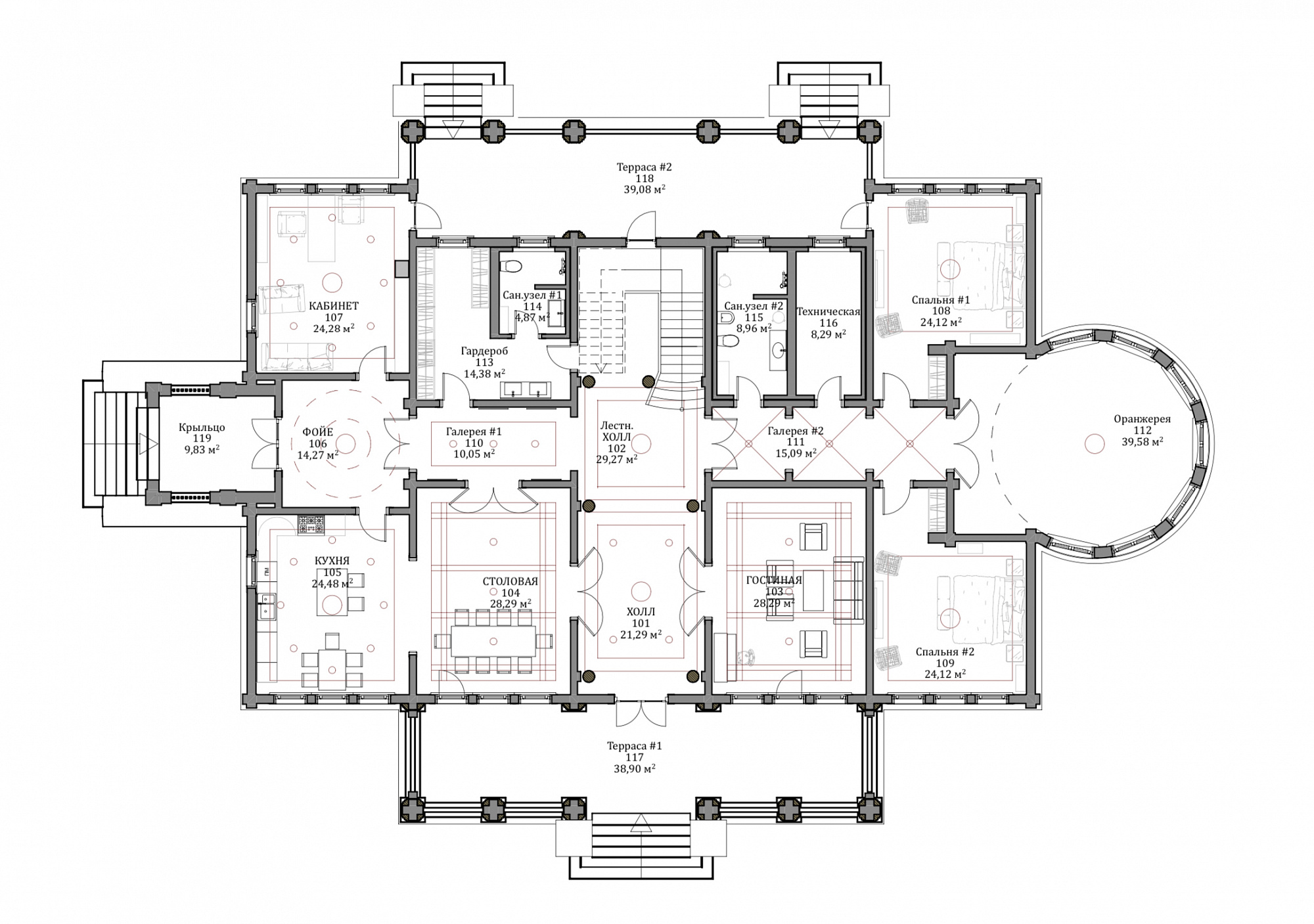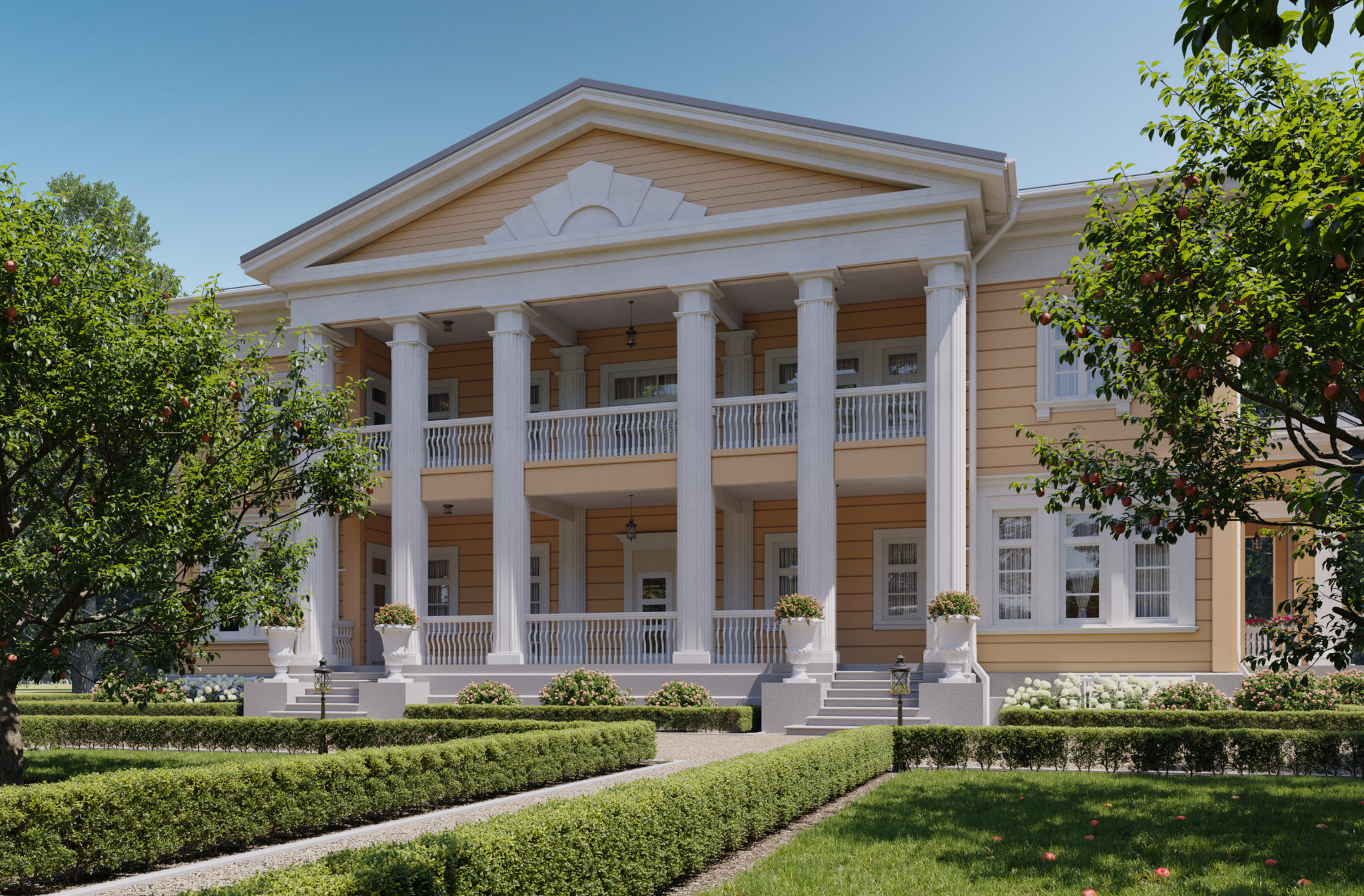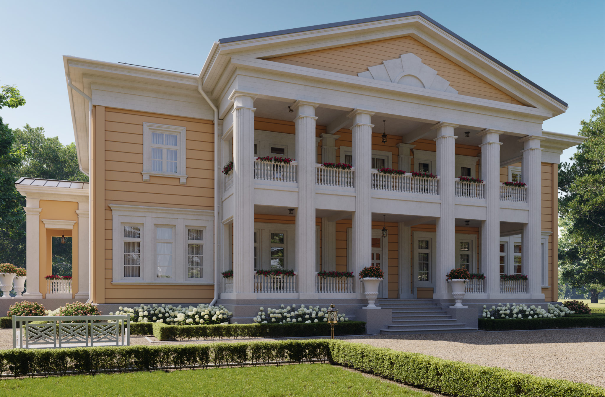 В рамках направления «Старково», цель которого — возрождение дворянской усадьбы, мы разработали проект «Дальний берег». Его уникальная планировка одновременно ориентирована на архитектуру знаменитой усадьбы Горки Ленинские и на лучшие современные образцы частных владений. Резиденция рассчитана на семью из четырёх человек. Уютное общее пространство гостиной, столовой и кухни спроектировано по принципу анфилады. Сквозь весь первый этаж, отделяя жилую часть от технических и вспомогательных помещений, проходит просторная галерея. Она ведёт от главного входа в зимнюю оранжерею. В галерее можно проводить светские приёмы и организовывать праздничные мероприятия. Помимо этого, на первом этаже находятся две просторные гостевые комнаты с отдельными ванными. Такое расположение спален позволяет гостям и хозяевам чувствовать себя более свободно и комфортно и соблюдать личные границы друг друга. Хозяйский кабинет мы разместили рядом с главным входом. Это даёт возможность эффективно работать, проводить совещания и принимать деловых партнеров в удобной обстановке с соблюдением целостности личного пространства. На втором этаже находятся большие хозяйские покои. В них есть просторный гардероб и отдельная ванная комната. Напротив мастер-спальни расположены детские комнаты со своими гардеробными и ваннами. Широкий холл второго этажа выходит на балкон, с которого открывается вид на живописный пейзаж. В холле есть возможность оборудовать библиотеку или разместить хозяйскую коллекцию. Усадьба «Дальний берег» подходит тем, кто заботится о своей репутации, ценит оригинальный подход к планированию пространства и с уважением относится к культурному наследию нашей страны.