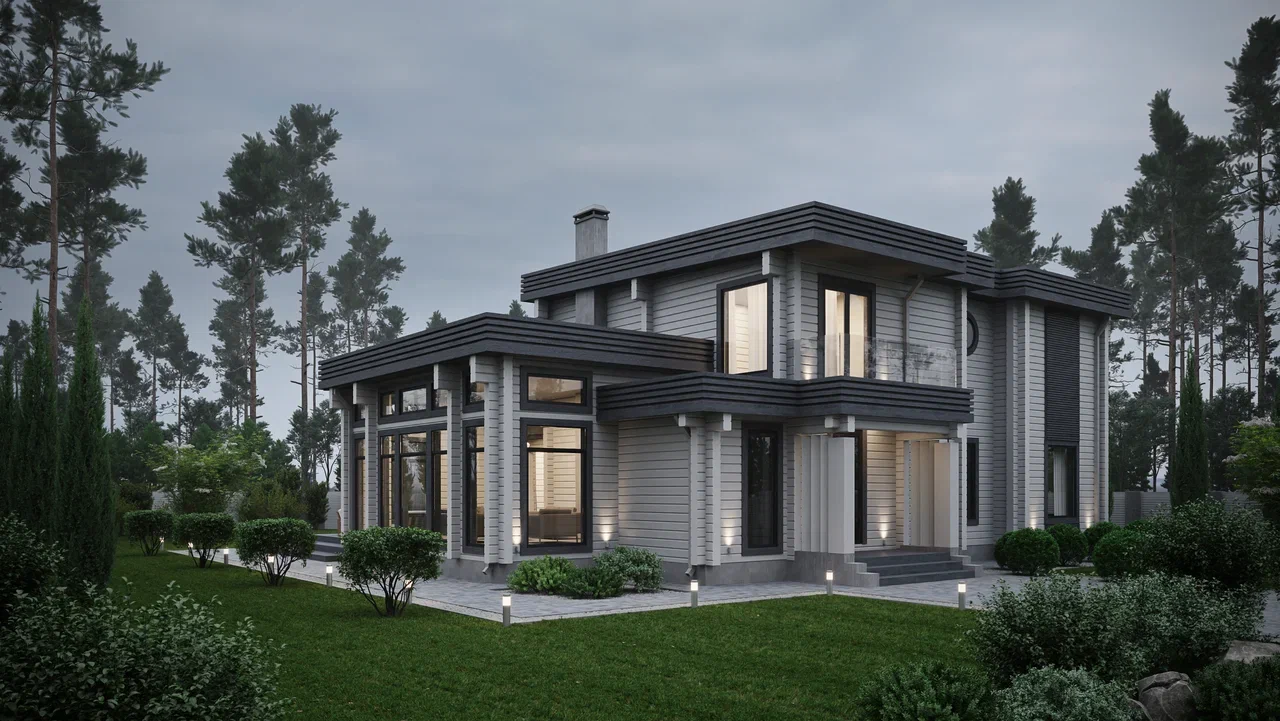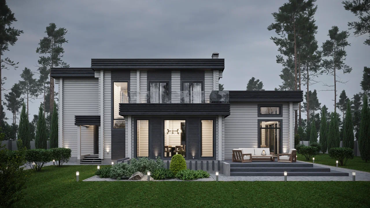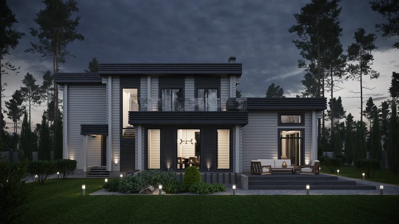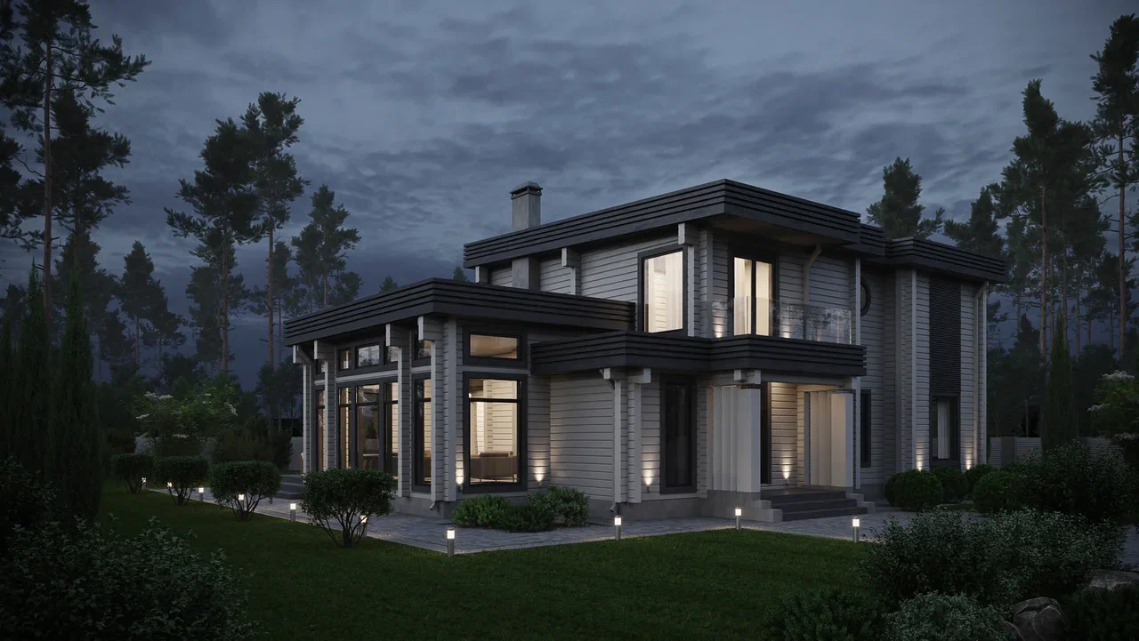 Очень лаконичный, современный дом с интересным решением проходной кухни со столовой, переходящей в гостиную, что создает общую открытую структуру внутреннего пространства, при этом не мешающие друг другу функционально. В доме имеется 4 спальни, что позволяет проживать в нем семье из 5-6 человек. Архитектура дома основана на простоте форм, которые подчеркнуты контрастными декоративными элементами, что создает его современный, индивидуальный образ.