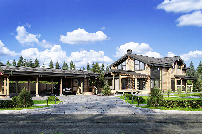 Двухэтажный дом из клееного бруса в классическом стиле. Лаконичная архитектура без утяжеляющих деталей, отдельными объемами выделены только одноэтажный блок веранды и входы с крытыми террасами. Декоративные фасадные решетки, расположенные между окнами разных этажей, визуально придают им целостность и выраженную вертикаль.