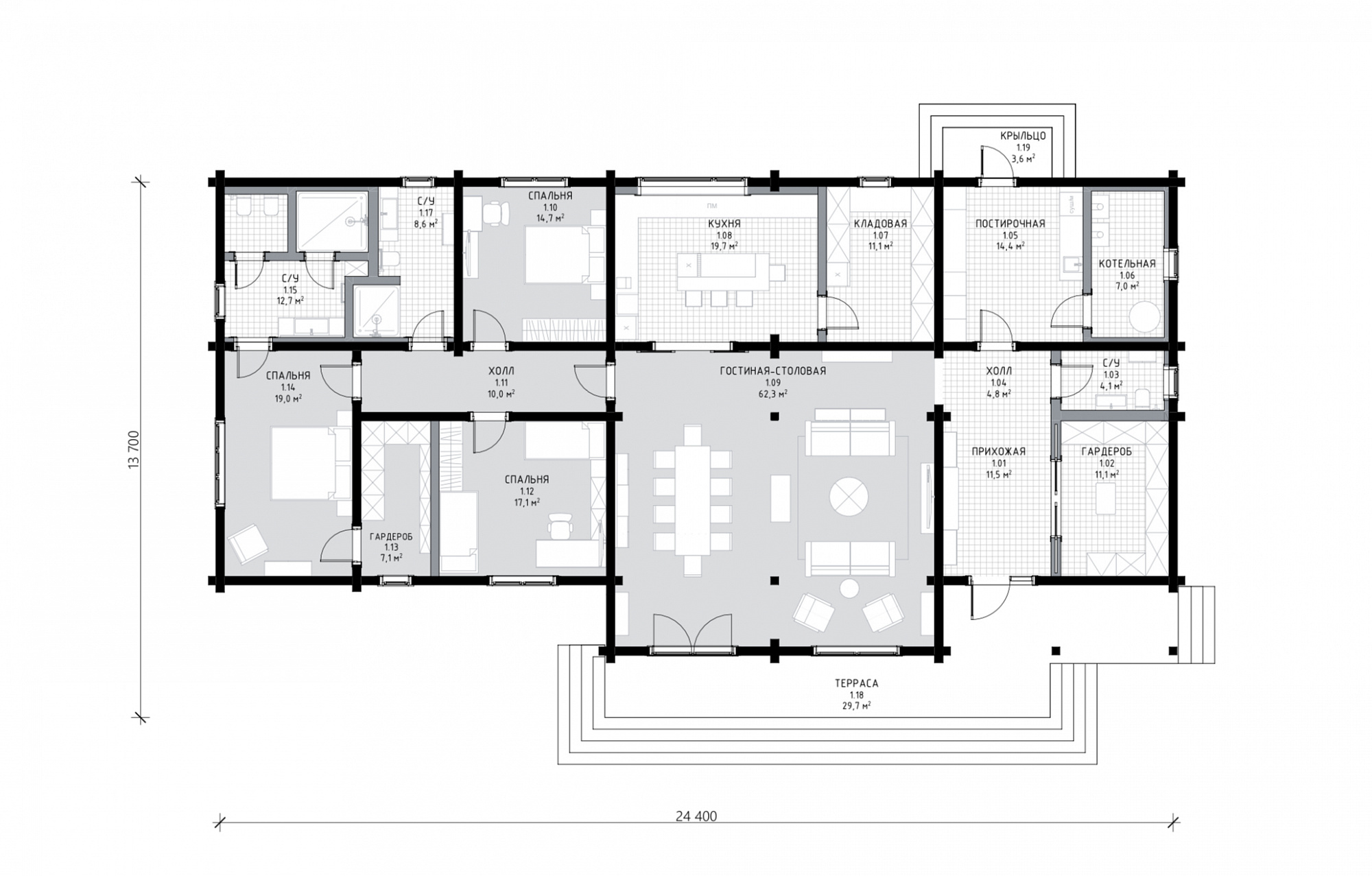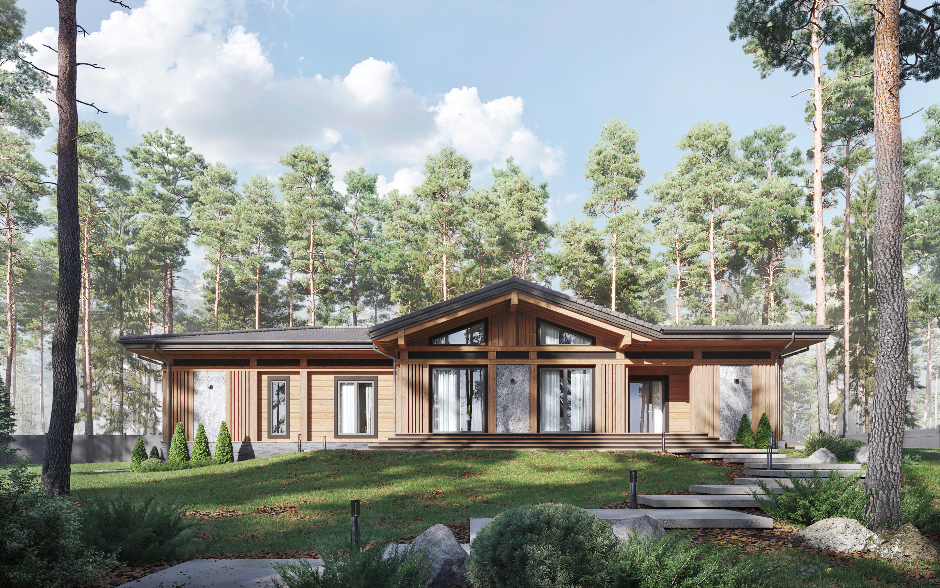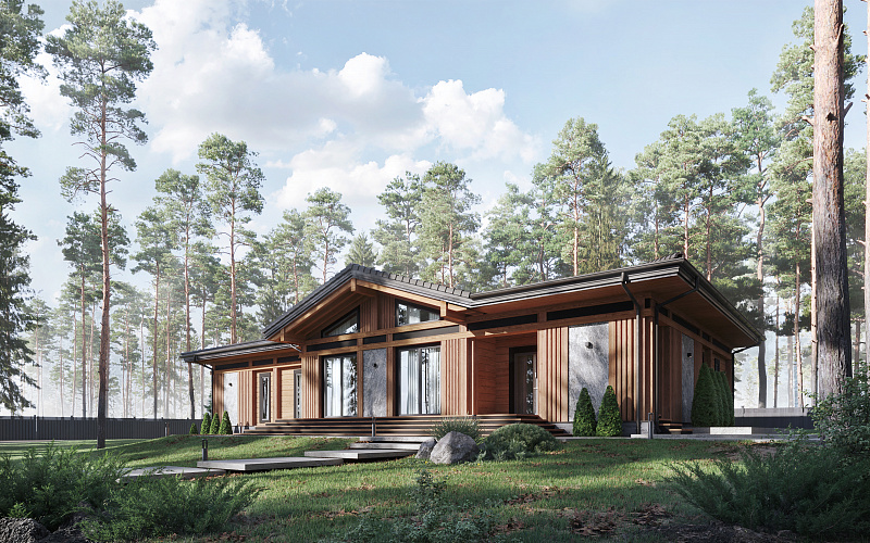 Одноэтажный дом в современном стиле из клееного бруса рассчитан на семью из пяти человек. В оформлении фасада использованы серые декоративные вставки под камень, придающие внешнему облику выразительную контрастность и динамичность. А панорамные окна обеспечивают качественное естественное освещение. Внутреннее пространство разделено на три функциональные части. Центральную занимает объединенная зона гостиной и столовой, имеющая выход на просторную террасу. Кухня отделена от общей зоны легкими раздвижными дверями. В левой части дома расположены мастер-спальня с ванной комнатой и своей гардеробной, а также две детские с общей ванной. Правое крыло отведено под входную зону с гардеробной и гостевой ванной комнатой. В этой же части дома находятся и технические помещения. Проект Крац идеально подойдет тем, кому важны лаконичность, современный подход к оформлению пространства и удобная планировка дома.