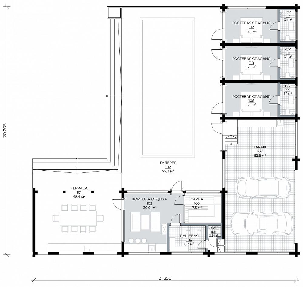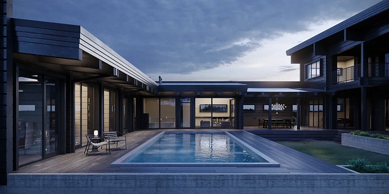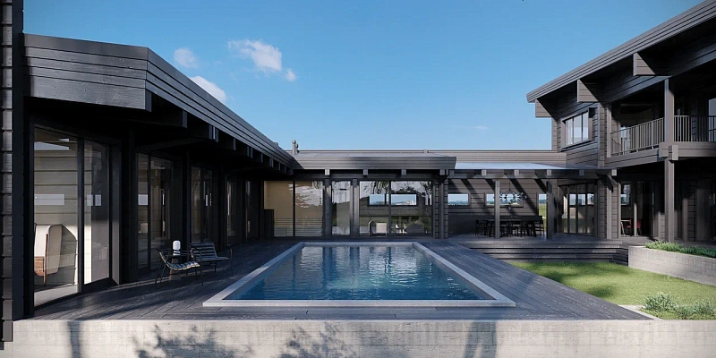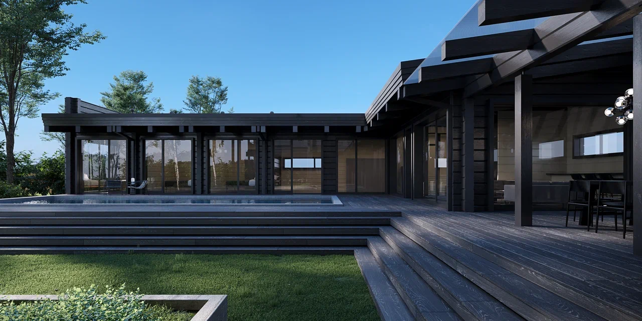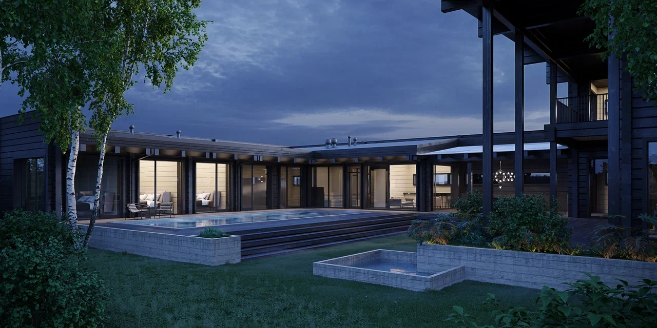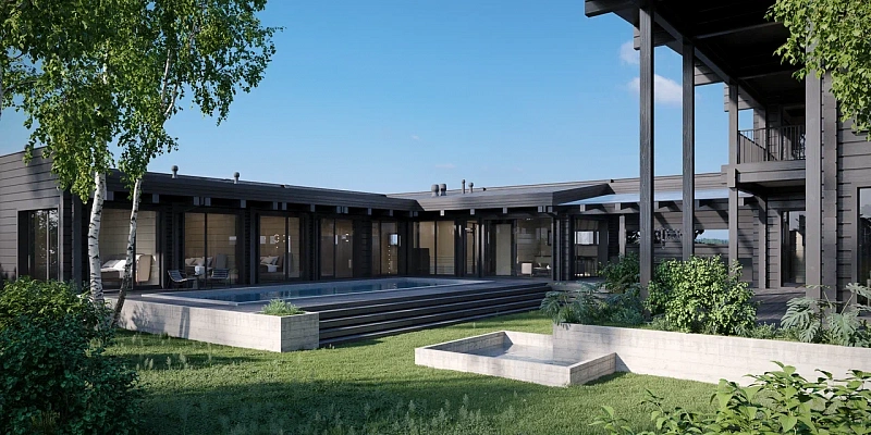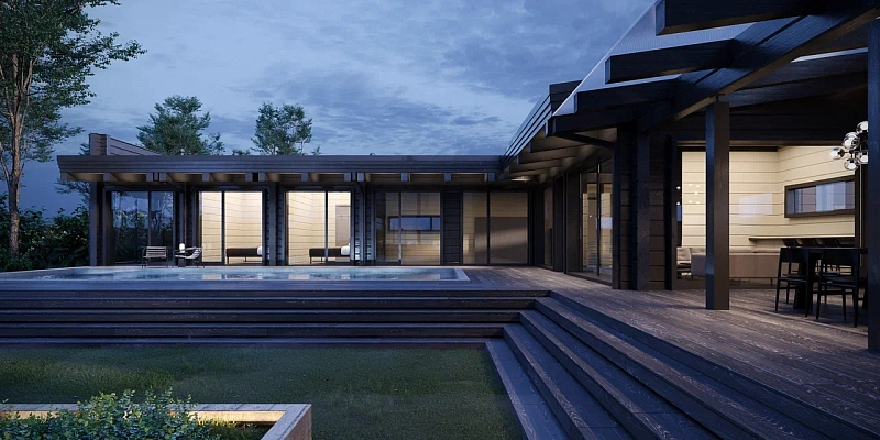 Гостевой дом из клееного бруса в современном стиле с сауной, 3-мя спальнями и открытым бассейном. Архитектура строения позволяет ему быть как отдельно стоящим объектом, так и продолжением дома, объединенным с помощью террас. Современный внешний облик постройке придает панорамное остекление вдоль двух главных фасадов, обращенных к бассейну, а также остекленный участок кровли в зоне открытой веранды. Планировка имеет Г-образную форму, разделяя приватную и общественную функцию на два вытянутых блока, коммуникация между которыми осуществляется по террасе. Все помещения, включая сауну, имеют остекление «в пол» с видом на бассейн и ландшафт заднего двора.