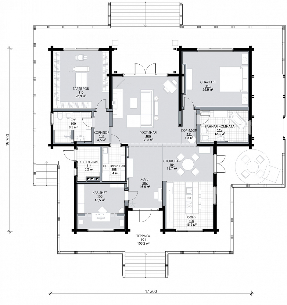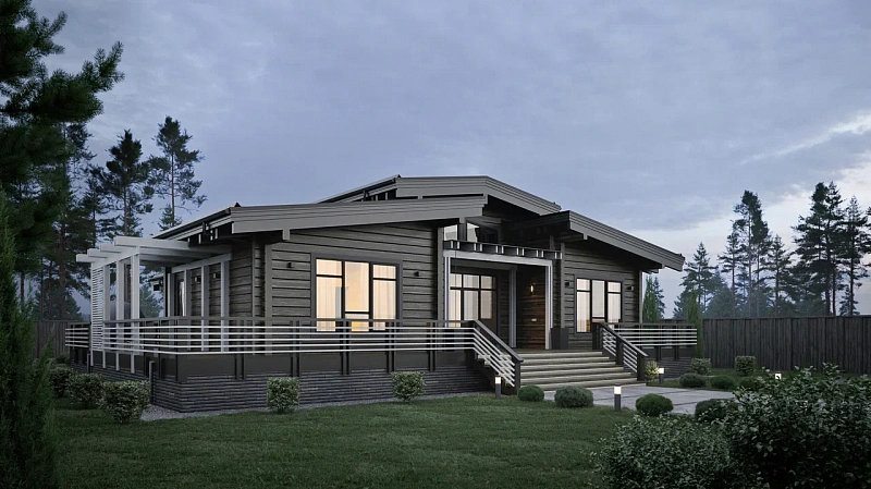 Одноэтажный дом для комфортного проживания небольшой семьи. Современный стиль проекта отлично дополняет продуманная эргономичная планировка. Благодаря большому количеству окон дом будет наполнен светом в течение всего дня. Также сделан упор на открытое пространство, которое создает комфортную атмосферу для общения. Внутренняя планировка имеет удобное зонирование. Просторная гостиная является центральным элементом дома. Представляет собой большое многофункциональное помещение, плавно перетекающее в холл и кухню-столовую. В доме также расположены спальня и гардероб с собственными ванными комнатами. Уединенный кабинет и необходимые технические помещения. Дом имеет три выхода на террасу, которая становится продолжением внутреннего пространства и в то же время является местом единения с природой. Проект «Рео» создан для тех, кто ценит качество жизни и удобство.