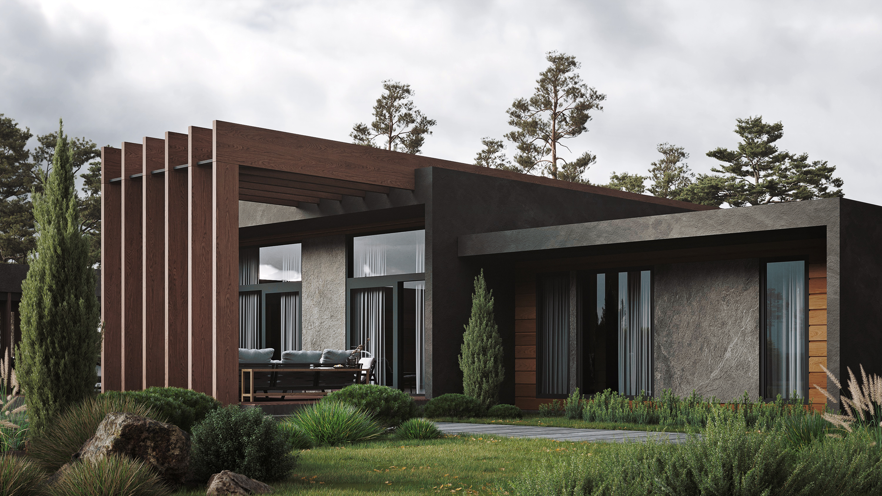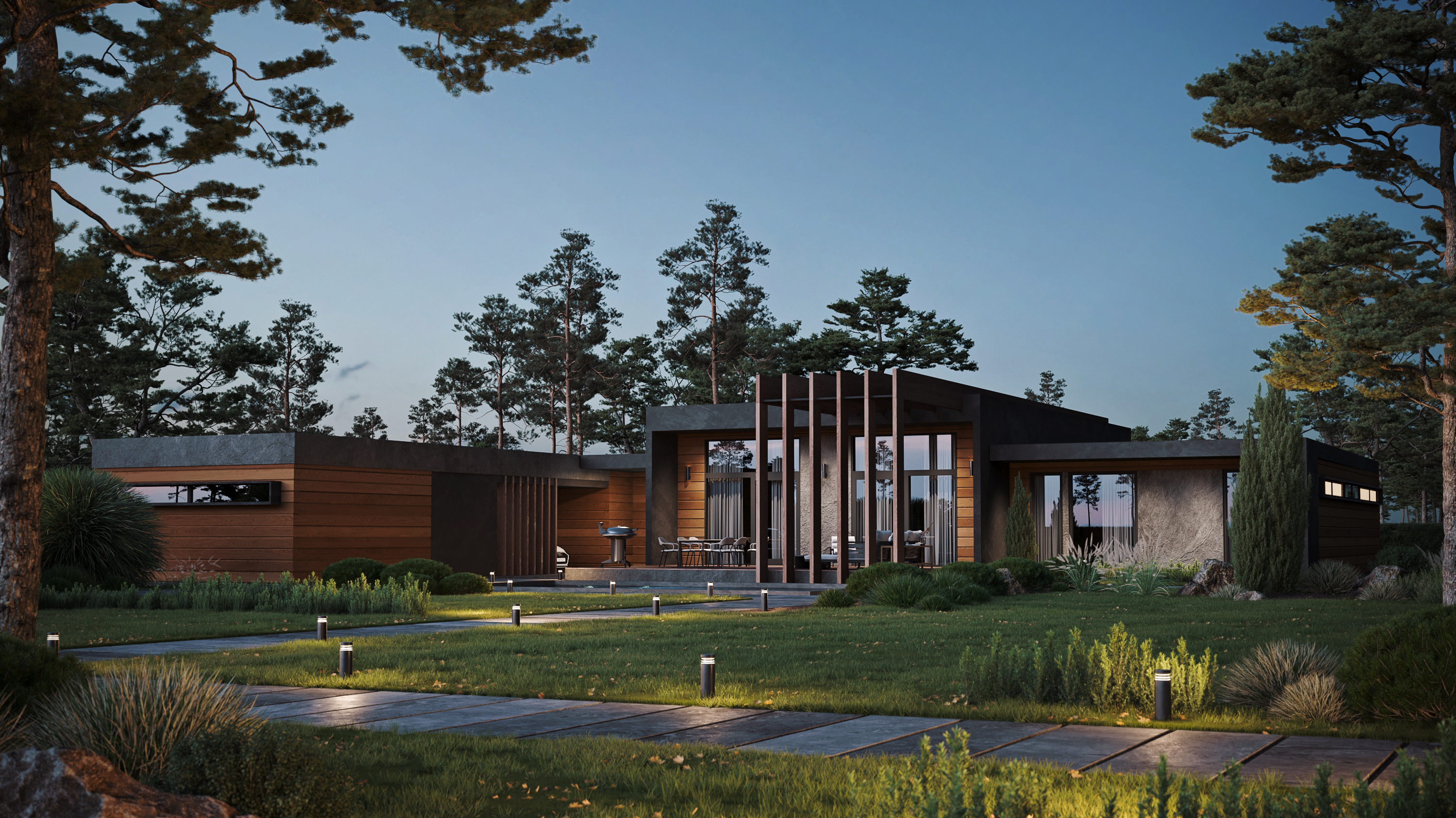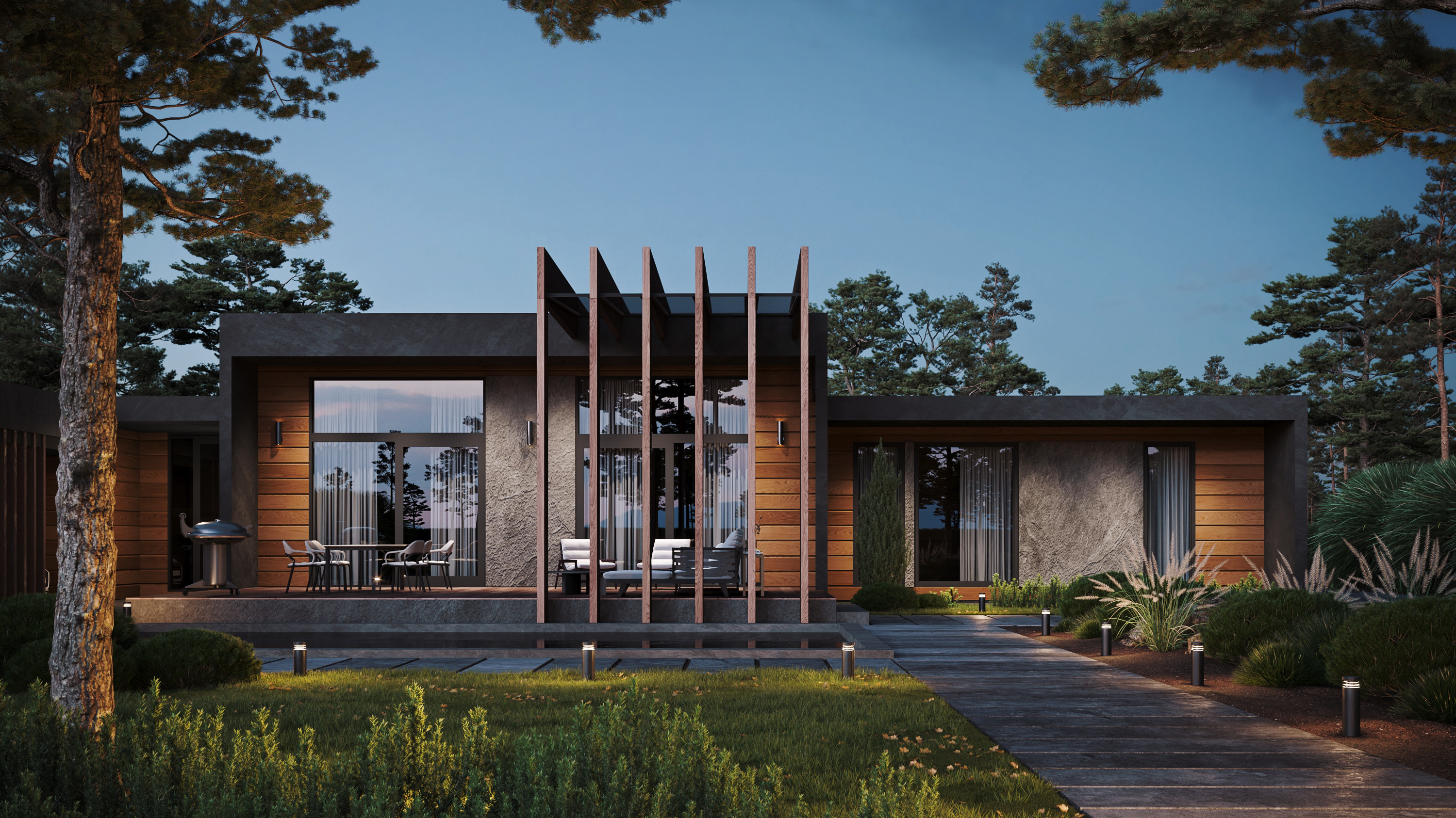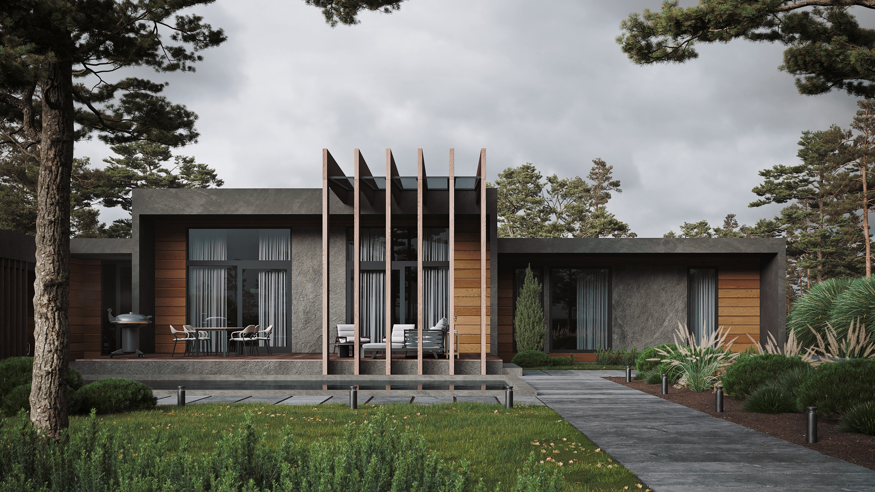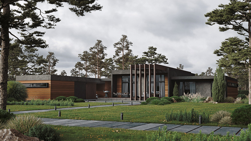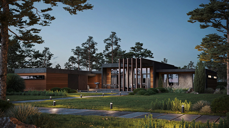 Современный одноэтажный дом, объединяющий в себе смелые архитектурные решения и широкий функционал внутреннего пространства. Дом спроектирован с учетом современной технологии строительства из клеёного бруса и применением City - угла. Дерево и каменная отделка фасада сланцем подчеркивают современность этого проекта. Легкий шарм брутальной архитектуре придает вертикальная пергола, покрытая натуральным шпоном. Панорамное остекление служит богатым источником дневного света в гостиной - столовой, которые эргономично объединены в общее пространство с кухней и холлом. В доме так же предусмотрены 2 детских комнаты с общей ванной комнатой, гостевая спальня и мастер-спальня с собственной ванной - душевой. Левое крыло дома отдано для зоны SPA с отдельным выходом на террасу с купелью. В общую концепцию дома интегрирован авто - паркинг с открытым навесом и закрытым гаражом на 4 автомобиля. Проект «Тиль» для тех, кто ценит стиль, удобство и элегантность.