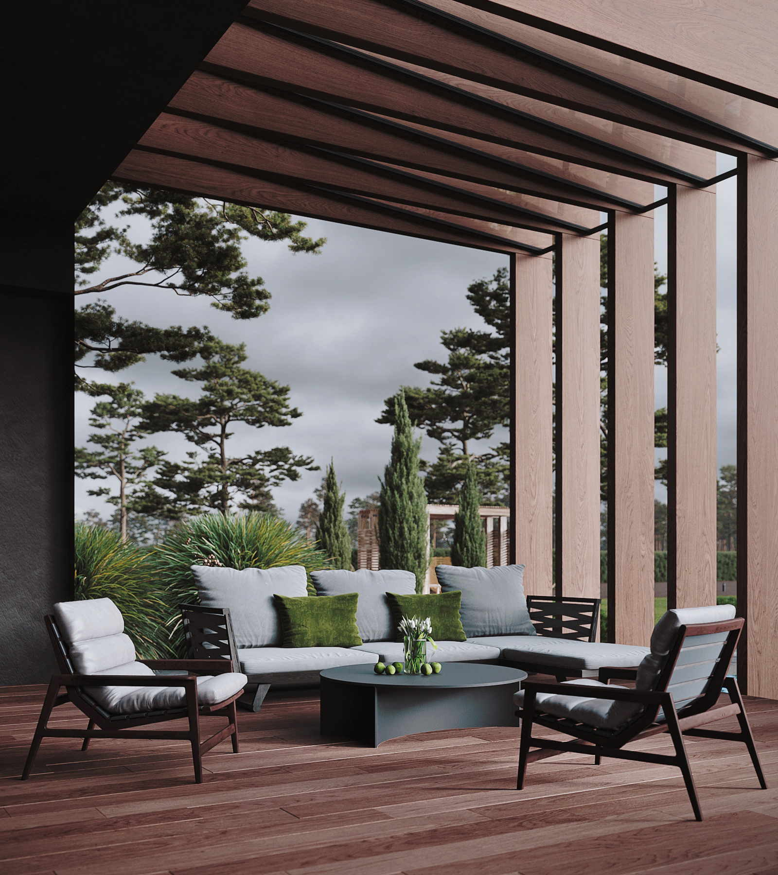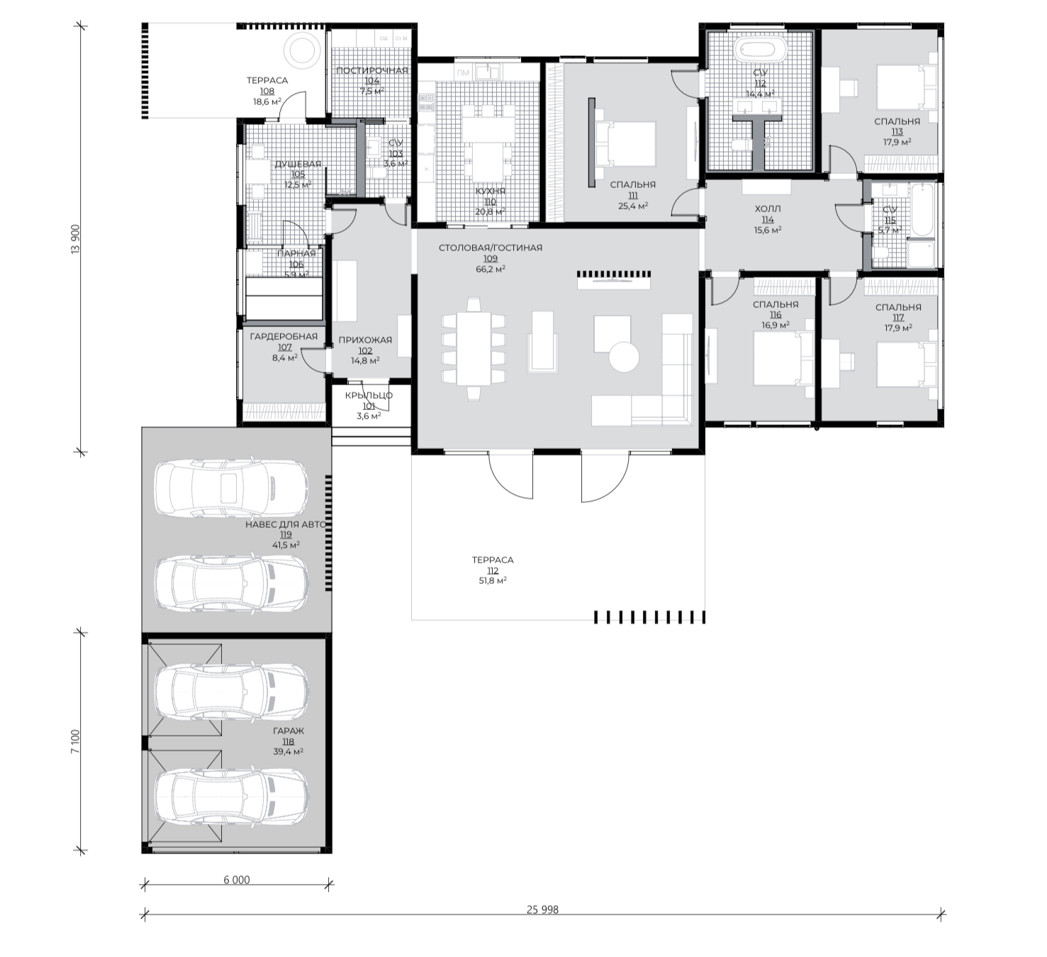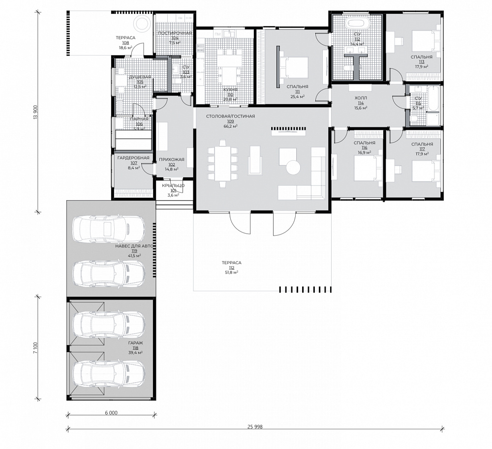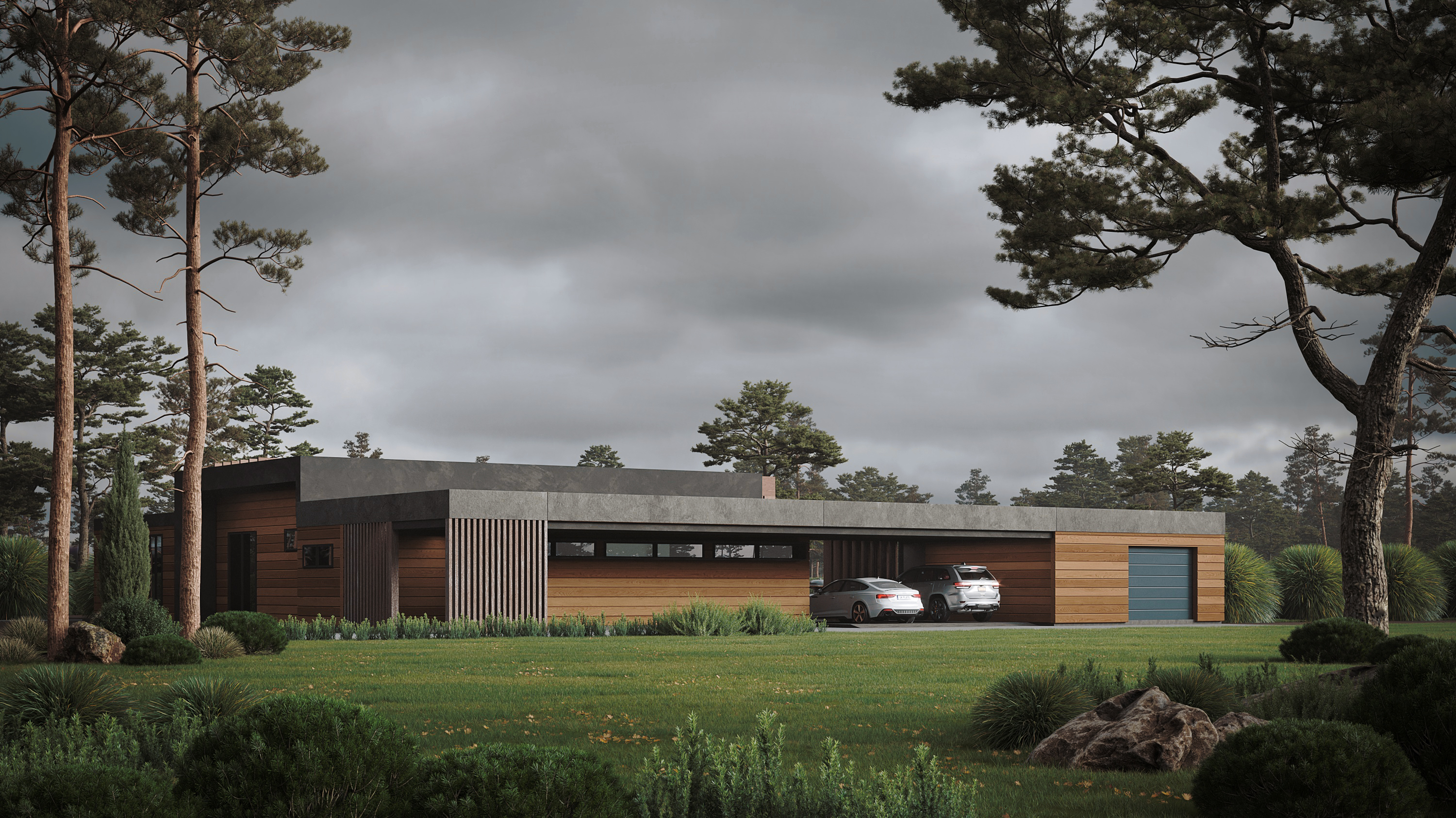 Современный одноэтажный дом, объединяющий в себе смелые архитектурные решения и широкий функционал внутреннего пространства. Дом спроектирован с учетом современной технологии строительства из клеёного бруса и применением City - угла. Дерево и каменная отделка фасада сланцем подчеркивают современность этого проекта. Легкий шарм брутальной архитектуре придает вертикальная пергола, покрытая натуральным шпоном. Панорамное остекление служит богатым источником дневного света в гостиной - столовой, которые эргономично объединены в общее пространство с кухней и холлом. В доме так же предусмотрены 2 детских комнаты с общей ванной комнатой, гостевая спальня и мастер-спальня с собственной ванной - душевой. Левое крыло дома отдано для зоны SPA с отдельным выходом на террасу с купелью. В общую концепцию дома интегрирован авто - паркинг с открытым навесом и закрытым гаражом на 4 автомобиля. Проект «Тиль» для тех, кто ценит стиль, удобство и элегантность.