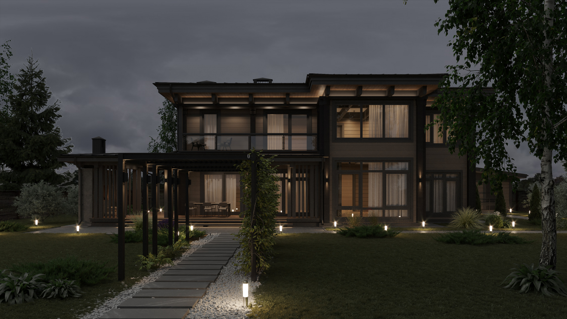 Двухэтажный дом рассчитан на семью из 4—5 человек. Колористическое решение фасада выполнено в светло-бежевом цвете, что в сочетании с отделкой серым каменным шпоном и панорамным остеклением придают архитектуре дома современный вид. Балки с тонкой резьбой и подсветка контуров крыши добавляют образу дома легкость. Возле главного входа расположена удобная парковочная площадка с навесом. Терраса на первом этаже объединена с зоной барбекю, на нее можно выйти из кухни и столовой. Второй свет в гостиной создает ощущение большого пространства, делает помещение эстетичнее. На первом этаже для детей обустроена игровая, на втором - две индивидуальные детские комнаты. Мастер-спальня оборудована гардеробной и отдельной ванной. С широкого балкона открывается прекрасный вид. Проект «Троодос» подходит для тех, кому дороги семейные ценности, комфорт и изящность.