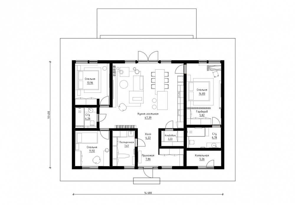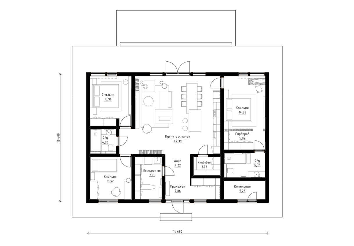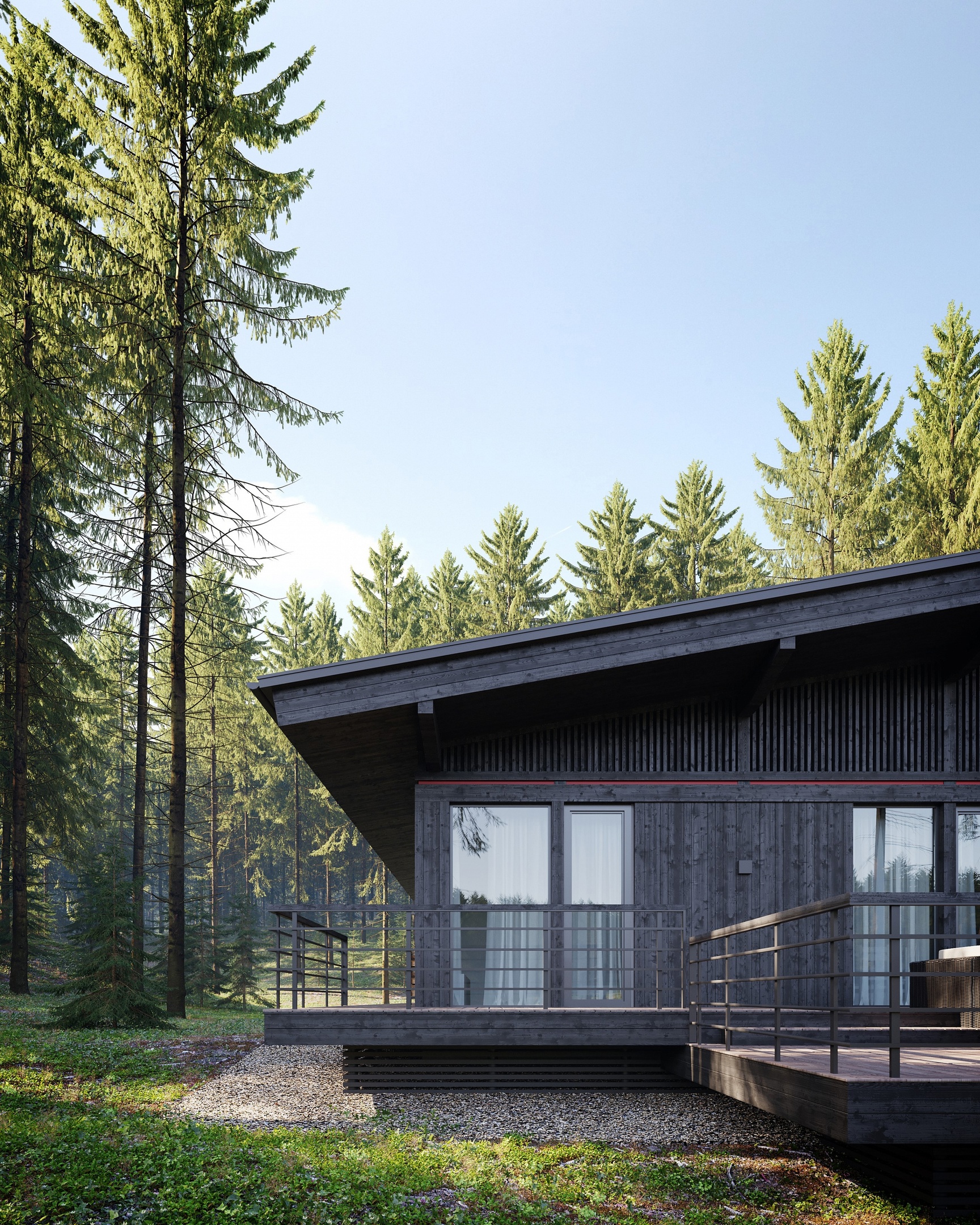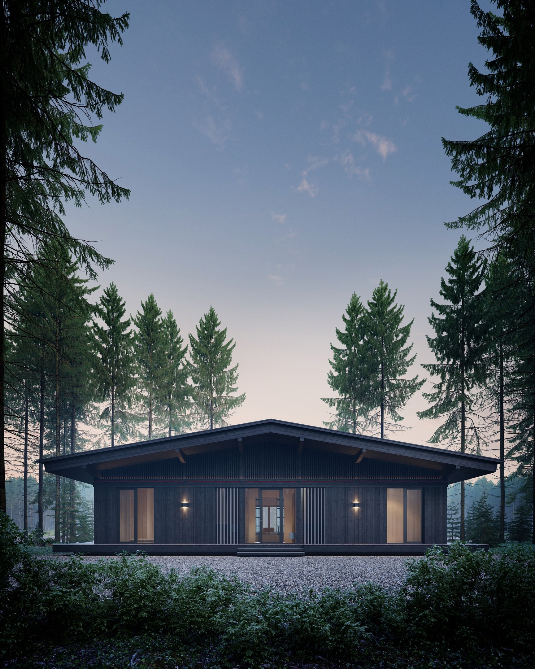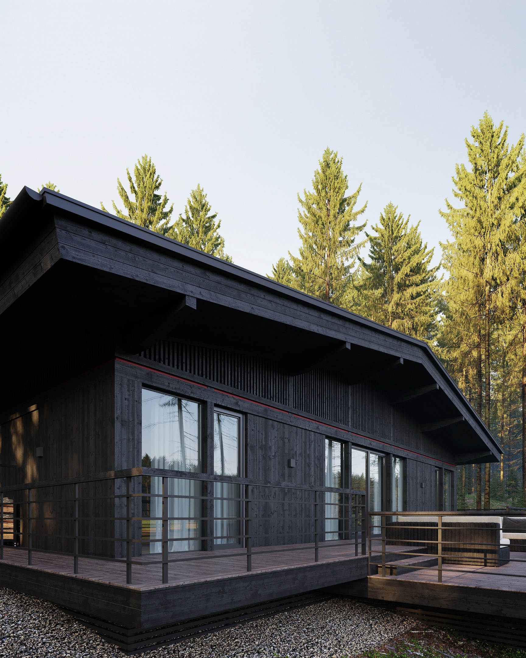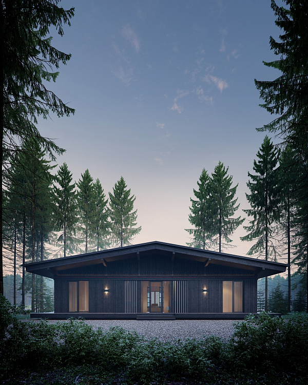 Одноэтажный дом выполнен в современном стиле по технологии фахверк и рассчитан на семью из 3—4 человек. Стены отделаны планкеном разной ширины, в отделке фронтонов используется брусок. Фасады выдержаны в глубоких темно-серых оттенках. Текстура дерева подчеркнута с помощью специальной обработки и создает оригинальный контраст с декоративным поясом, идущим по периметру фасадов. Акцентная красная вставка дополняет образ. Декоративная подсветка фасадов, фронтонов и террасы подчеркивает современную стилистику архитектуры. Внутренняя планировка продумана с максимальной практичностью. К прихожей примыкают гардеробная и удобная прачечная. Техническая зона оборудована отдельным входом. Гостиная совмещена со столовой и кухней. В зоне гостиной — потолки с увеличенной высотой, которые делают пространство еще более просторным. В кухне обустроена удобная кладовая. Из зоны гостиной-столовой можно выйти на большую террасу. В приватной зоне расположены мастер-спальня со своей ванной комнатой и отдельной гардеробной и две комфортных детских с общей ванной.