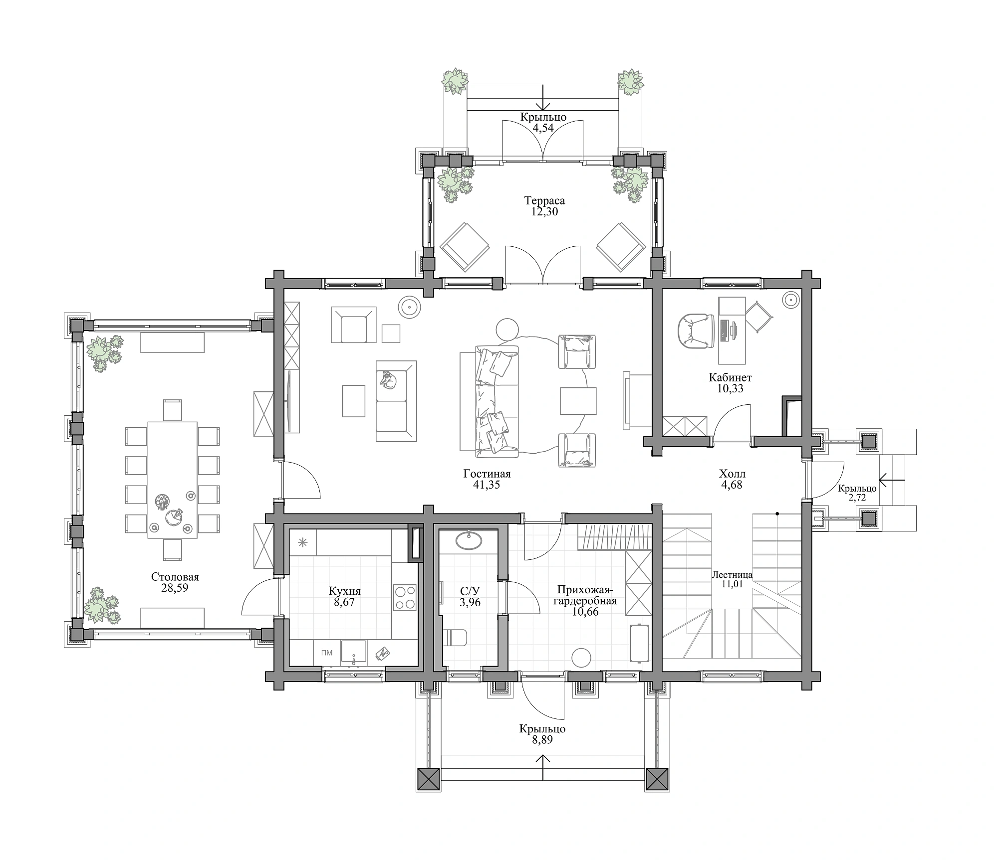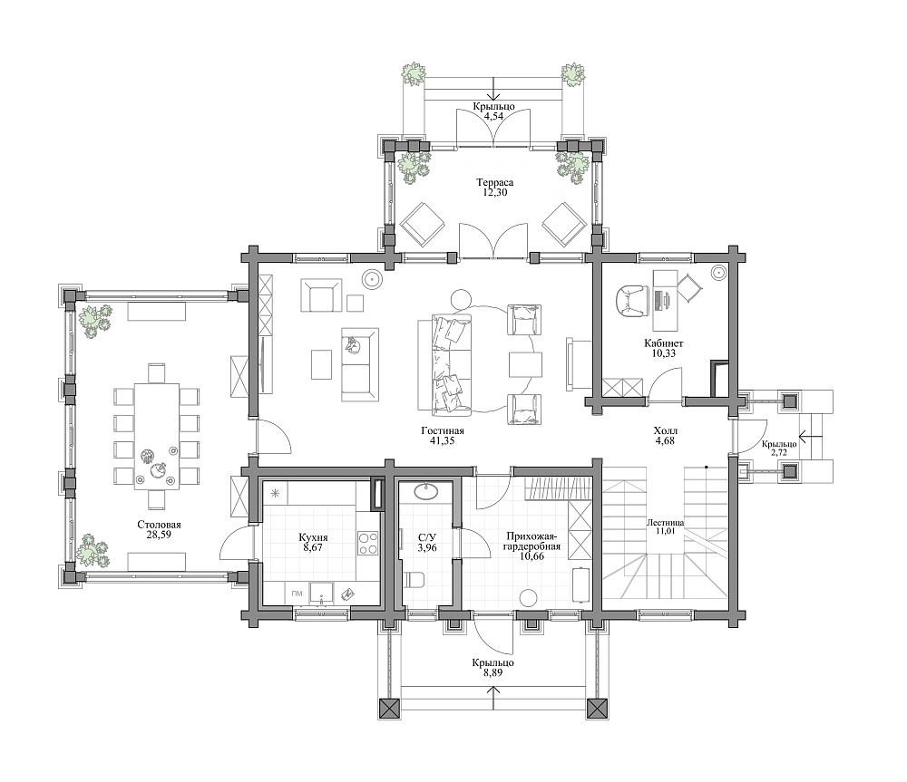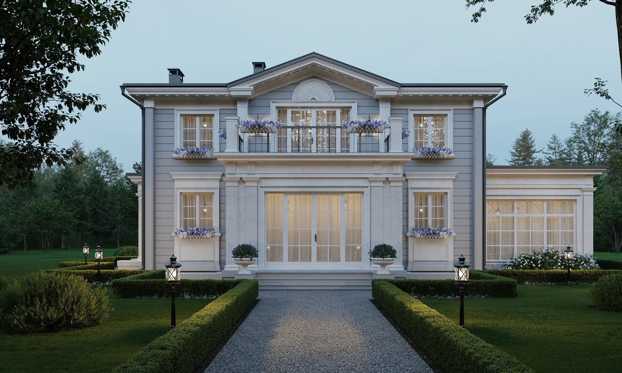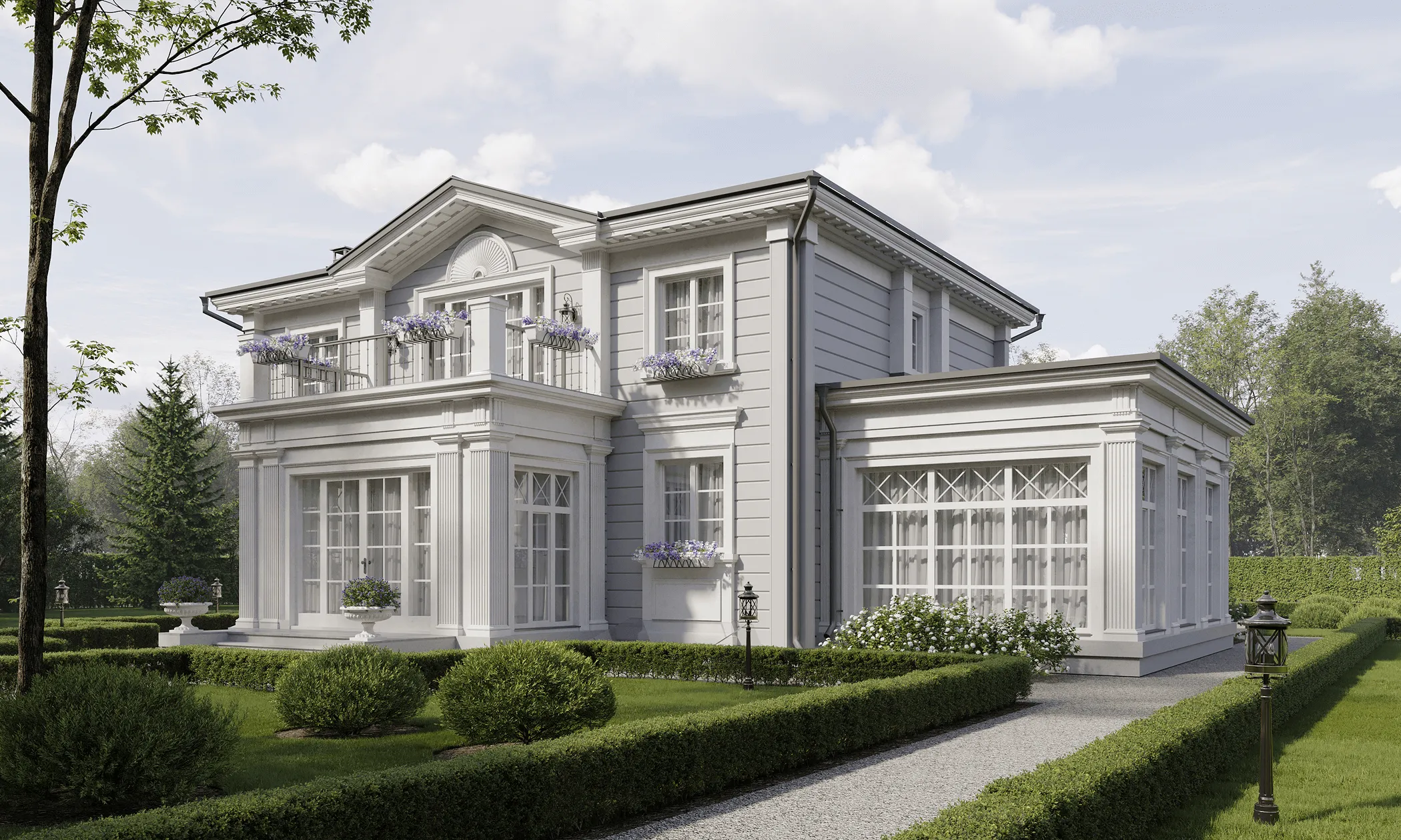 Дом в стиле русская усадьба в живописном месте рядом с лесом – таким был запрос семейной пары. Стиль выбран не случайно: участок располагается в Калужской области недалеко от монастыря Оптина Пустынь, и дом должен гармонично вписываться в местный архитектурный и природный ландшафт. Это не просто дача, а место, где время замедляет свой бег. Как прекрасно просыпаться утром под пение птиц и видеть за окном зелёный простор леса, который плавно перетекает в спокойствие монастырских куполов. А вечера проводить в тепле камина за семейными беседами или общением с гостями. Здесь можно найти вдохновение, уединение, гармонию с собой и окружающим миром. Этот дом создан для того, чтобы лелеять семейные традиции и дарить радость. Перед специалистами стояла задача воссоздать облик русской усадьбы. А это не просто дом – это целостный архитектурно-ландшафтный ансамбль. Участок граничит с лесом, что создает иллюзию перехода в пейзажный парк и лесные угодья, как это было в усадьбах XVIII века. Симметричное двухэтажное здание из бруса площадью 237,77 м2 венчает вальмовая крыша с фронтонами по двум сторонам. Три входные группы и терраса украшены колоннами, а окна – элегантными наличниками, характерными для стиля усадьбы. Фасады выполнены в светло-сером цвете с белыми колоннами и наличниками. Изюминка проекта – витражные панорамные окна столовой и террасы. Дом спланирован таким образом, чтобы обеспечить семье и персоналу комфорт и приватность. Первый этаж занимает площадь 147,7 м2. С главного крыльца вход ведет в просторную прихожую-гардеробную с системой хранения и санузлом. В центральной части этажа – гостиная с мягкой зоной, камином и зоной ТВ. Из гостиной можно выйти на террасу. Благодаря теплому полу здесь можно поддерживать комфортную температуру даже в холодное время года. В левом крыле находится большая столовая для приема гостей площадью 28,59 м2. Оттуда ведет вход в кухню – ее специально сделали изолированной, чтобы запахи от приготовления пищи не распространялись по дому. Правое крыло первого этажа занимают кабинет и холл с лестницей на второй этаж. На втором этаже площадью 90,07 м2 находятся две спальни – обе оборудованы гардеробными и санузлами. Мастер-спальня 16,15 м2 с панорамным остеклением имеет выход на видовой балкон площадью 12,66 м2. В гостевой спальне тоже панорамное окно и французский балкон. Комнаты разделены просторным холлом и представляют собой два самодостаточных блока. Высота потолков на первом этаже 3 м, на втором – переменная: от 2,5 до 3,5 м.